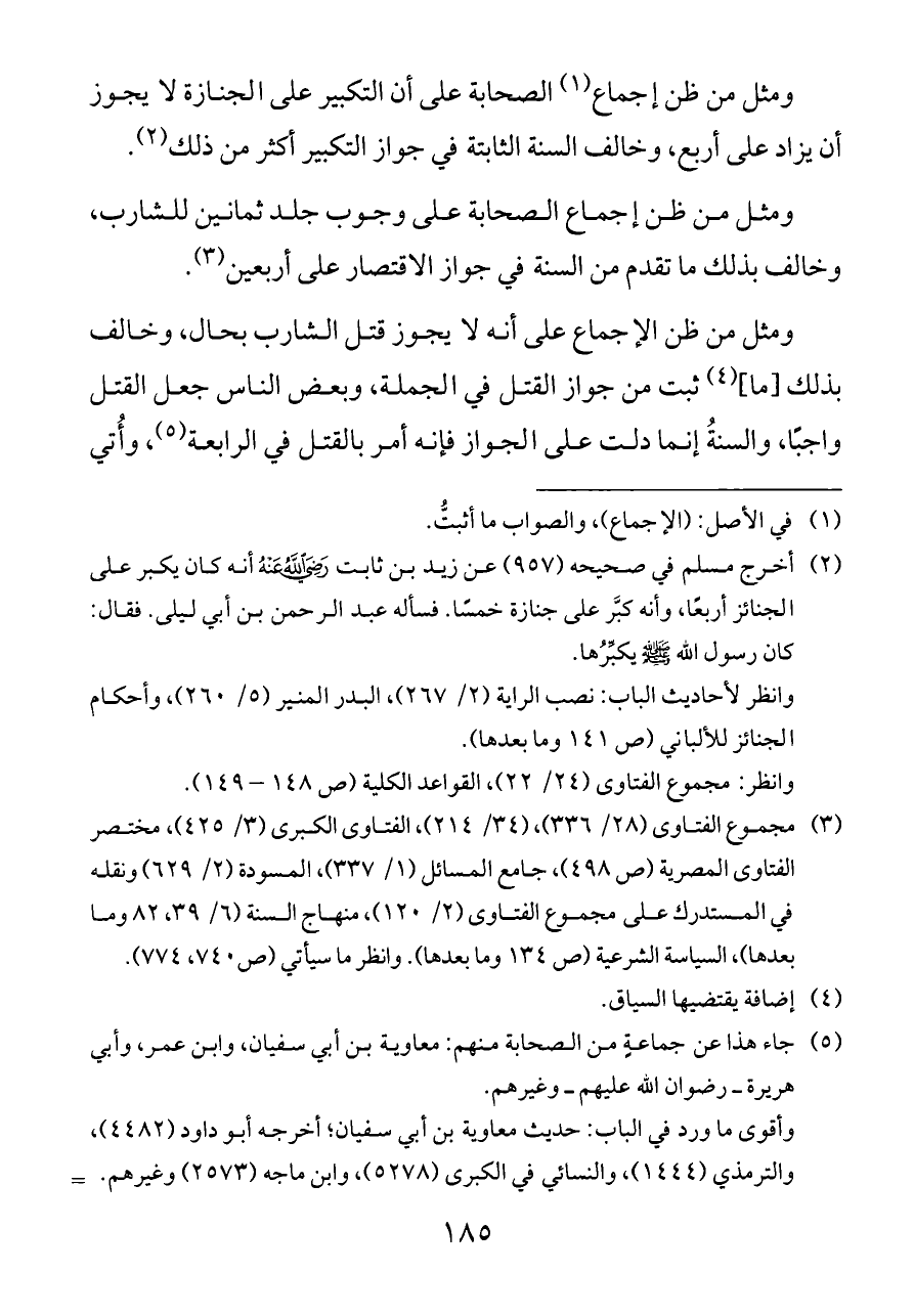 ومثل من ظن إجماع (¬١) الصحابة على أن التكبير على الجنازة لا يجوز أن يزاد على أربع، وخالف السنة الثابتة في جواز التكبير أكثر من ذلك (¬٢).