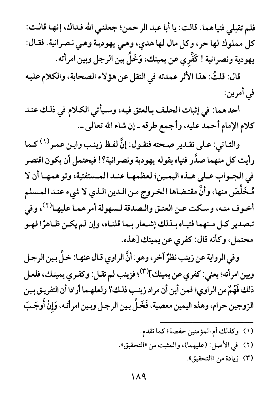 فلم تقبلي فتياهما. قالت: يا أبا عبد الرحمن؛ جعلني الله فداك، إنها قالت: كل مملوك لها حر، وكل مال لها هدي، وهي يهودية وهي نصرانية. فقال: يهودية ونصرانية! كَفِّرِي عن يمينك، وَخَلِّ بين الرجل وبين امرأته.