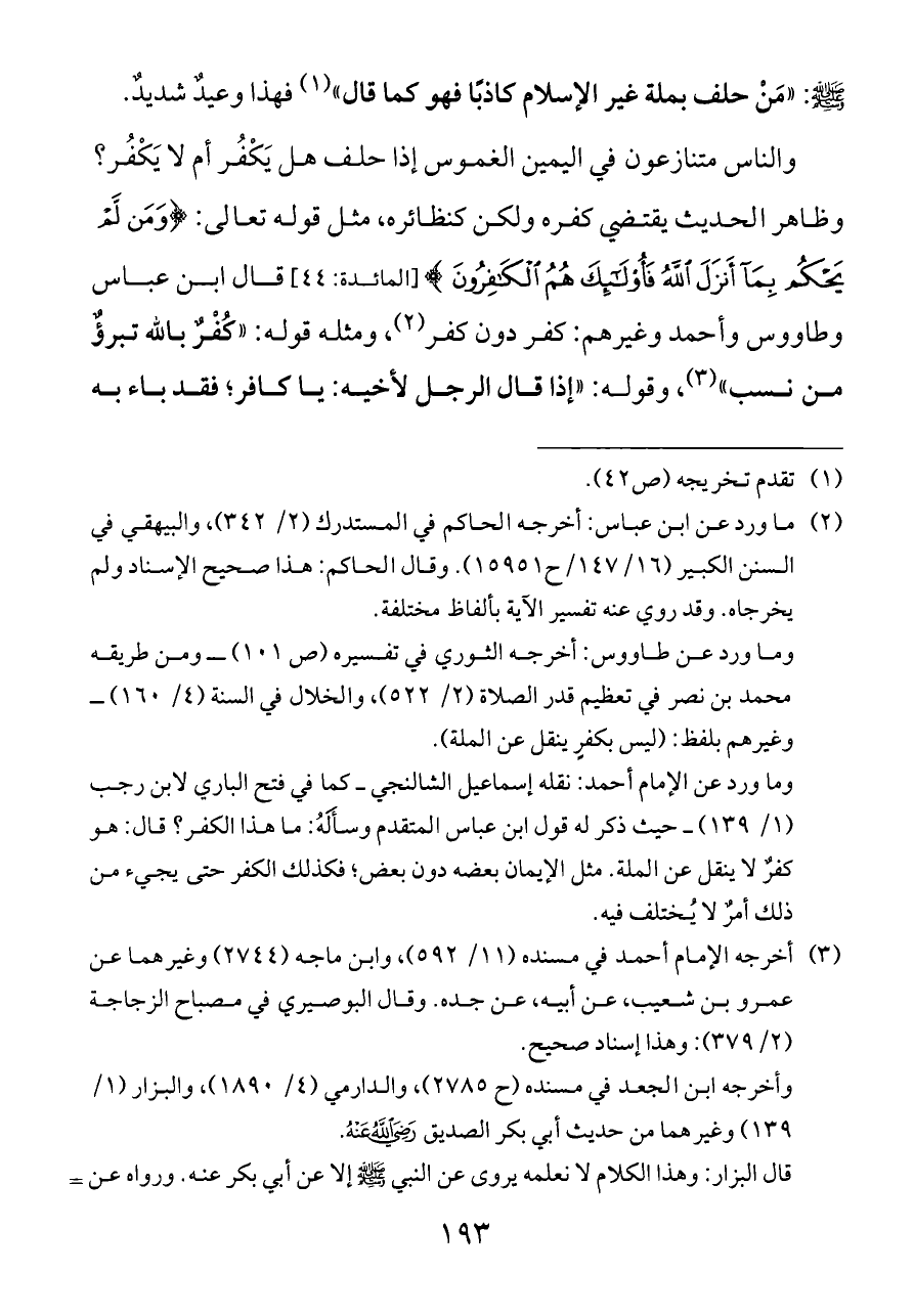 وما ورد عن الإمام أحمد: نقله إسماعيل الشالنجي ــ كما في فتح الباري لابن رجب (١/ ١٣٩) ــ حيث ذكر له قول ابن عباس المتقدم وسأَلَهُ: ما هذا الكفر؟ قال: هو كفرٌ لا ينقل عن الملة. مثل الإيمان بعضه دون بعض؛ فكذلك الكفر حتى يجيء من ذلك أمرٌ لا يُختلف فيه.