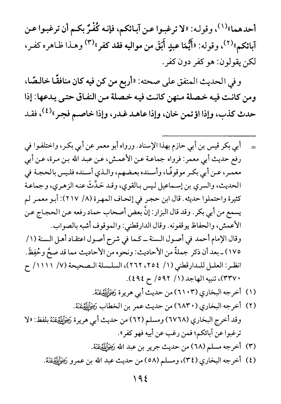 أحدهما» (¬١)، وقوله: «لا ترغبوا عن آبائكم، فإنه كُفْرٌ بكم أن ترغبوا عن آبائكم» (¬٢)، وقوله: «أَيُّمَا عبدٍ أَبَقَ من مواليه فقد كفر» (¬٣) وهذا ظاهره كفر، لكن يقولون: هو كفر دون كفر.