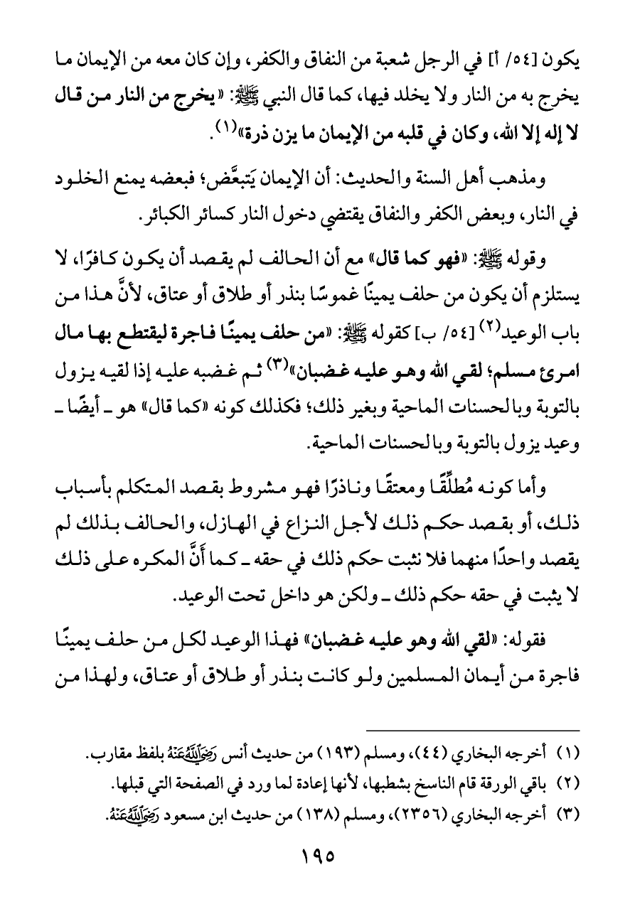 وقوله - صلى الله عليه وسلم -: «فهو كما قال» مع أن الحالف لم يقصد أن يكون كافرًا، لا يستلزم أن يكون من حلف يمينًا غموسًا بنذر أو طلاق أو عتاق، لأنَّ هذا من باب الوعيد (¬٢) [٥٤/ ب] كقوله - صلى الله عليه وسلم -: «من حلف يمينًا فاجرة ليقتطع بها مال امرئ مسلم؛ لقي الله وهو عليه غضبان» (¬٣) ثم غضبه عليه إذا لقيه يزول بالتوبة وبالحسنات الماحية وبغير ذلك؛ فكذلك كونه «كما قال» هو ــ أيضًا ــ وعيد يزول بالتوبة وبالحسنات الماحية.