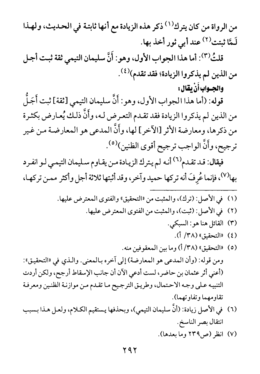 قوله: (أما هذا الجواب الأول، وهو: أَنَّ سليمان التيمي [ثقة] ثبت أَجَلُّ من الذين لم يذكروا الزيادة فقد تقدم التعرض له، وأَنَّ ذلك يُعارض بكثرة من ذكرها، ومعارضة الأثر [الآخر] لها، وأَنَّ المدعى هو المعارضة من غير ترجيح، وأَنَّ الواجب ترجيح أقوى الظنين) (¬٥).