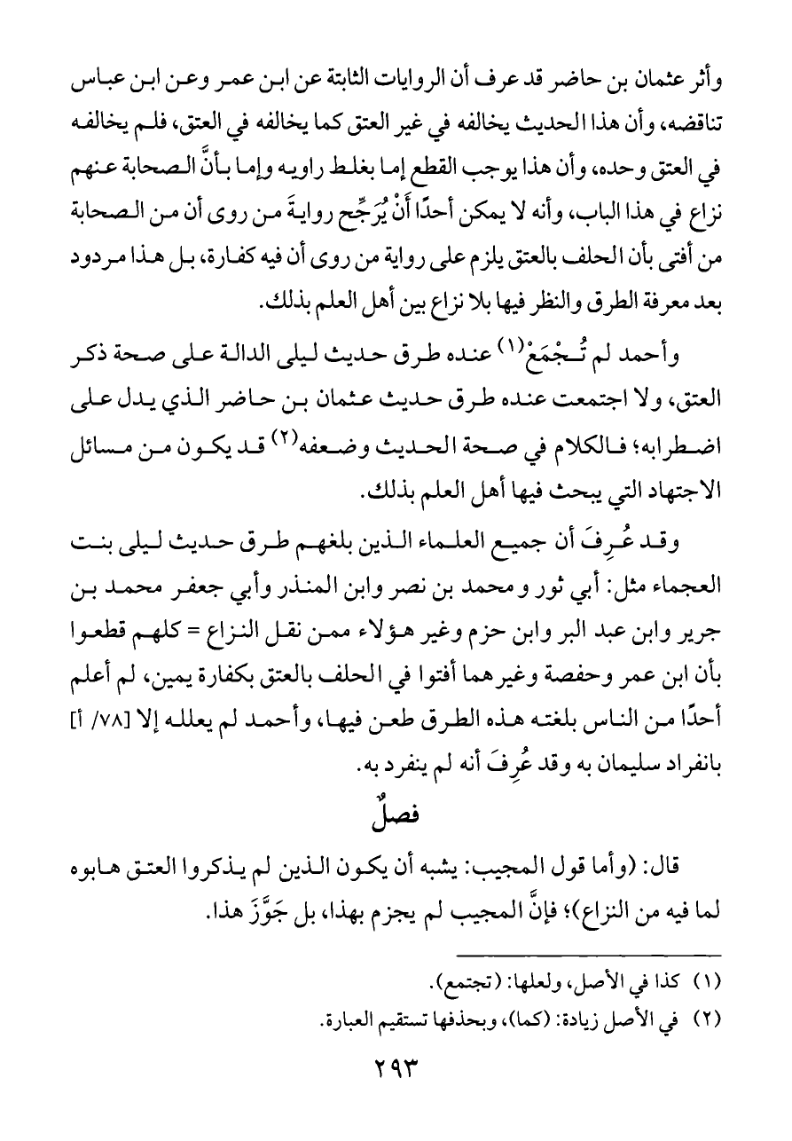 وقد عُرِفَ أن جميع العلماء الذين بلغهم طرق حديث ليلى بنت العجماء مثل: أبي ثور ومحمد بن نصر وابن المنذر وأبي جعفر محمد بن جرير وابن عبد البر وابن حزم وغير هؤلاء ممن نقل النزاع = كلهم قطعوا بأن ابن عمر وحفصة وغيرهما أفتوا في الحلف بالعتق بكفارة يمين، لم أعلم أحدًا من الناس بلغته هذه الطرق طعن فيها، وأحمد لم يعلله إلا [٧٨/ أ] بانفراد سليمان به وقد عُرِفَ أنه لم ينفرد به.