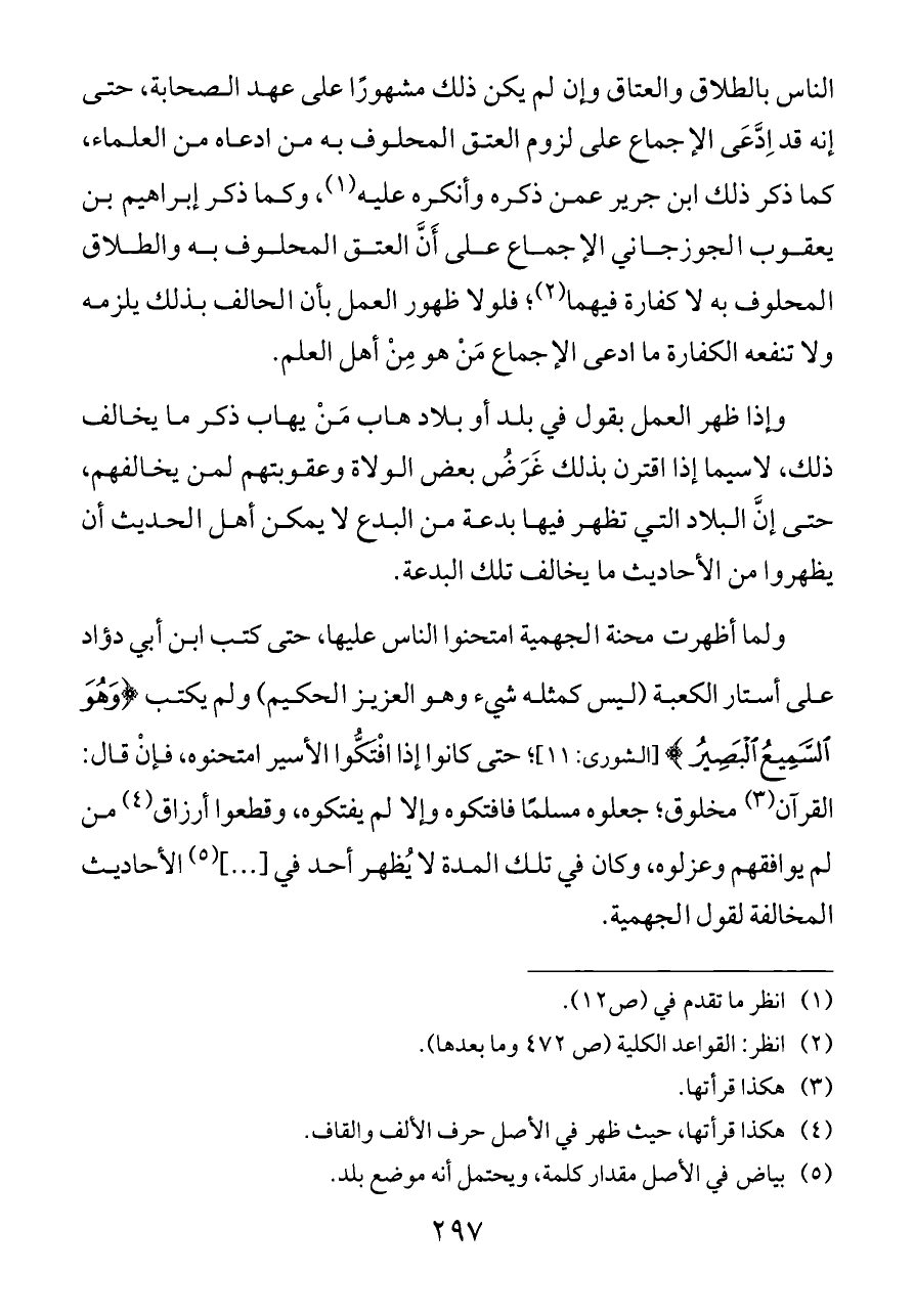 الناس بالطلاق والعتاق وإن لم يكن ذلك مشهورًا على عهد الصحابة، حتى إنه قد اِدَّعَى الإجماع على لزوم العتق المحلوف به من ادعاه من العلماء، كما ذكر ذلك ابن جرير عمن ذكره وأنكره عليه (¬١)، وكما ذكر إبراهيم بن يعقوب الجوزجاني الإجماع على أَنَّ العتق المحلوف به والطلاق المحلوف به لا كفارة فيهما (¬٢)؛ فلولا ظهور العمل بأن الحالف بذلك يلزمه ولا تنفعه الكفارة ما ادعى الإجماع مَنْ هو مِنْ أهل العلم.