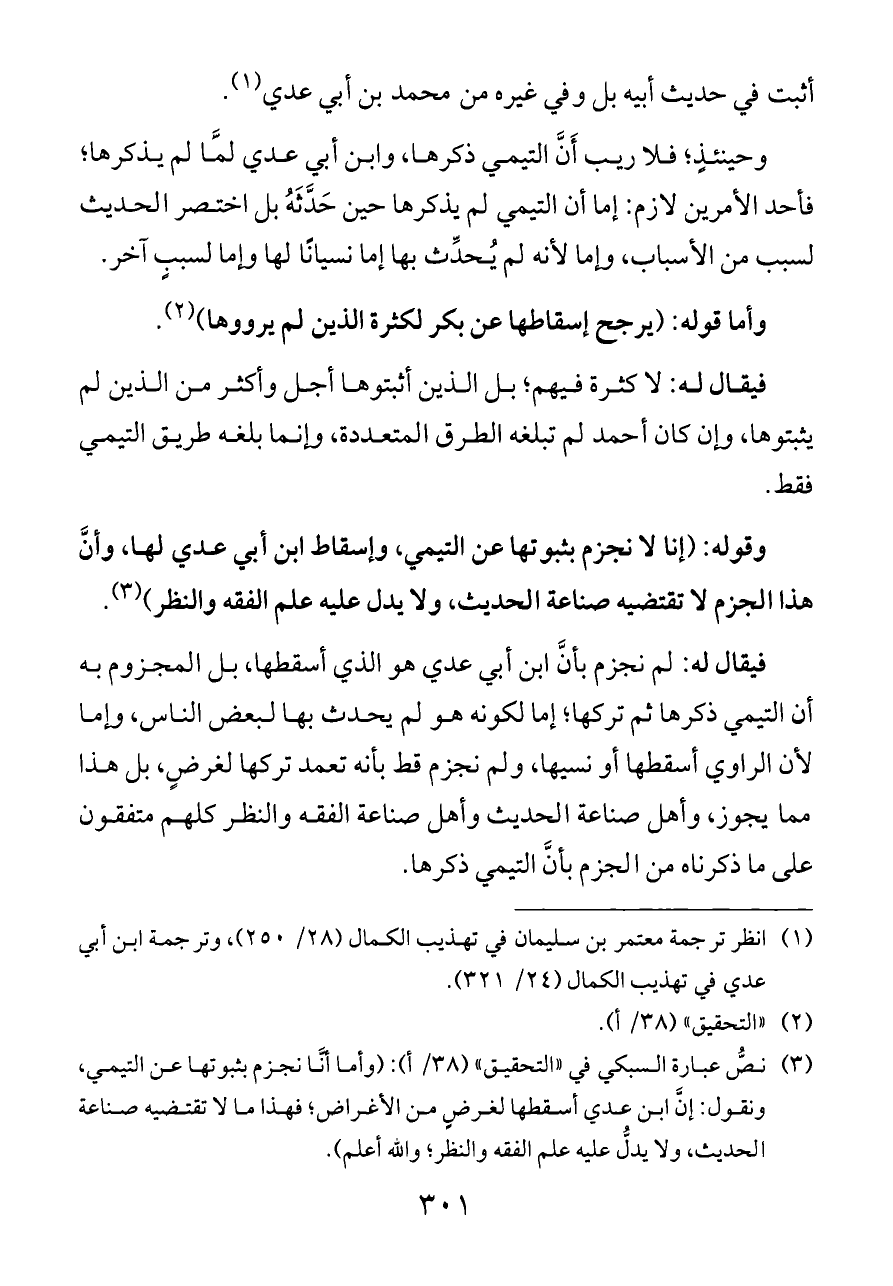 (¬٣) نصُّ عبارة السبكي في «التحقيق» (٣٨/ أ): (وأما أنَّا نجزم بثبوتها عن التيمي، ونقول: إنَّ ابن عدي أسقطها لغرضٍ من الأغراض؛ فهذا ما لا تقتضيه صناعة الحديث، ولا يدلُّ عليه علم الفقه والنظر؛ والله أعلم).