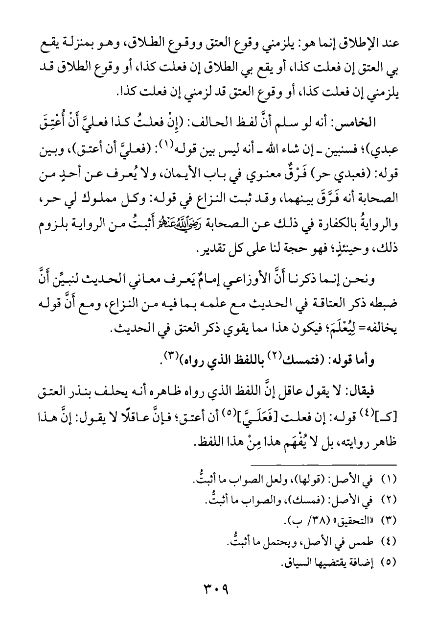 الخامس: أنه لو سلم أنَّ لفظ الحالف: (إِنْ فعلتُ كذا فعليَّ أَنْ أُعْتِقَ عبدي)؛ فسنبين ــ إن شاء الله ــ أنه ليس بين قوله (¬١): (فعليَّ أن أعتق)، وبين قوله: (فعبدي حر) فَرْقٌ معنوي في باب الأيمان، ولا يُعرف عن أحدٍ من الصحابة أنه فَرَّقَ بينهما، وقد ثبت النزاع في قوله: وكل مملوك لي حر، والروايةُ بالكفارة في ذلك عن الصحابة - رضي الله عنهم - أَثبتُ من الرواية بلزوم ذلك، وحينئذٍ؛ فهو حجة لنا على كل تقدير.