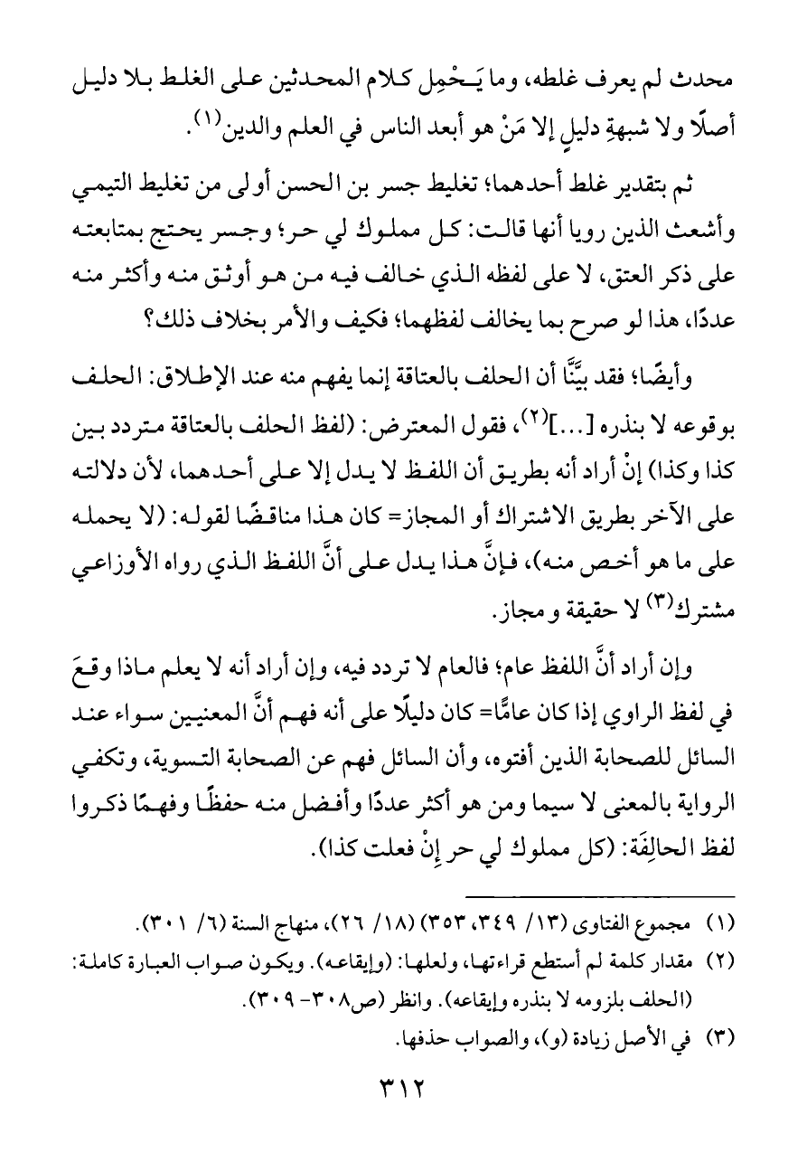وإن أراد أنَّ اللفظ عام؛ فالعام لا تردد فيه، وإن أراد أنه لا يعلم ماذا وقعَ في لفظ الراوي إذا كان عامًّا= كان دليلًا على أنه فهم أنَّ المعنيين سواء عند السائل للصحابة الذين أفتوه، وأن السائل فهم عن الصحابة التسوية، وتكفي الرواية بالمعنى لا سيما ومن هو أكثر عددًا وأفضل منه حفظًا وفهمًا ذكروا لفظ الحالِفَة: (كل مملوك لي حر إِنْ فعلت كذا).