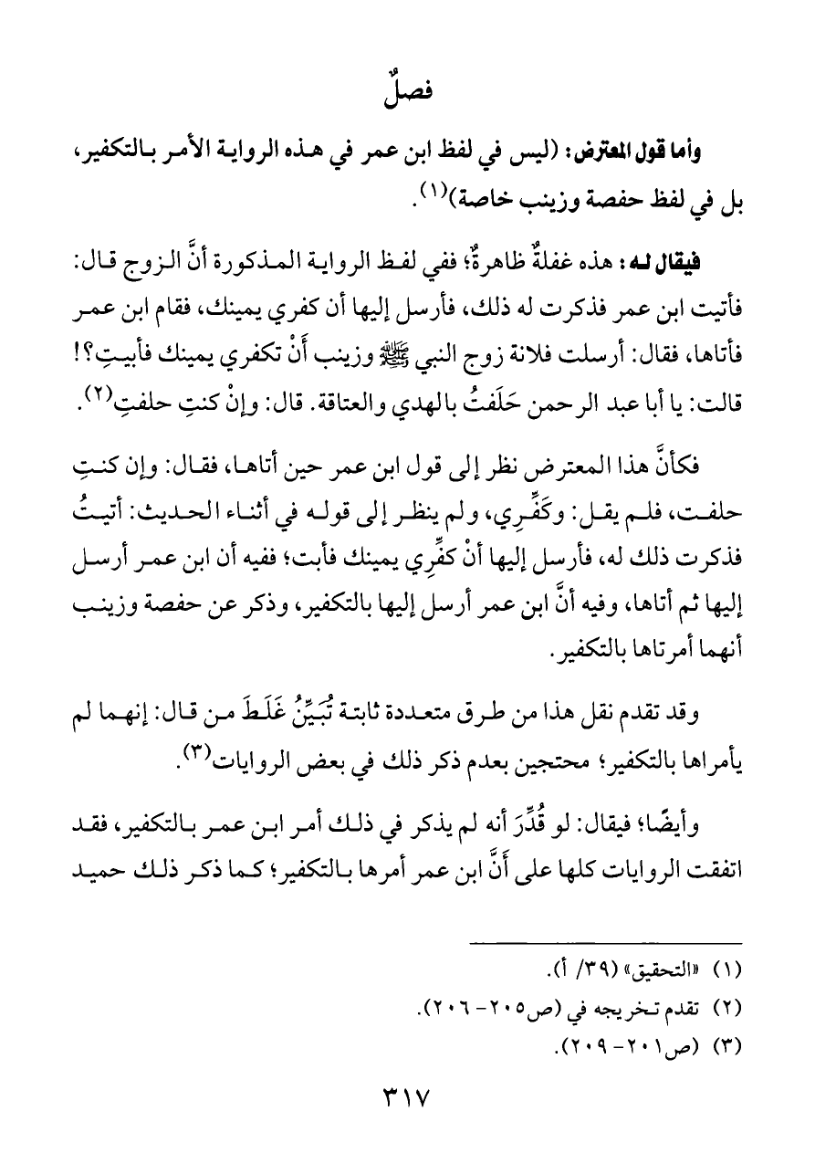 فكأنَّ هذا المعترض نظر إلى قول ابن عمر حين أتاها، فقال: وإن كنتِ حلفت، فلم يقل: وكَفِّرِي، ولم ينظر إلى قوله في أثناء الحديث: أتيتُ فذكرت ذلك له، فأرسل إليها أنْ كفِّرِي يمينك فأبت؛ ففيه أن ابن عمر أرسل إليها ثم أتاها، وفيه أنَّ ابن عمر أرسل إليها بالتكفير، وذكر عن حفصة وزينب أنهما أمرتاها بالتكفير.
