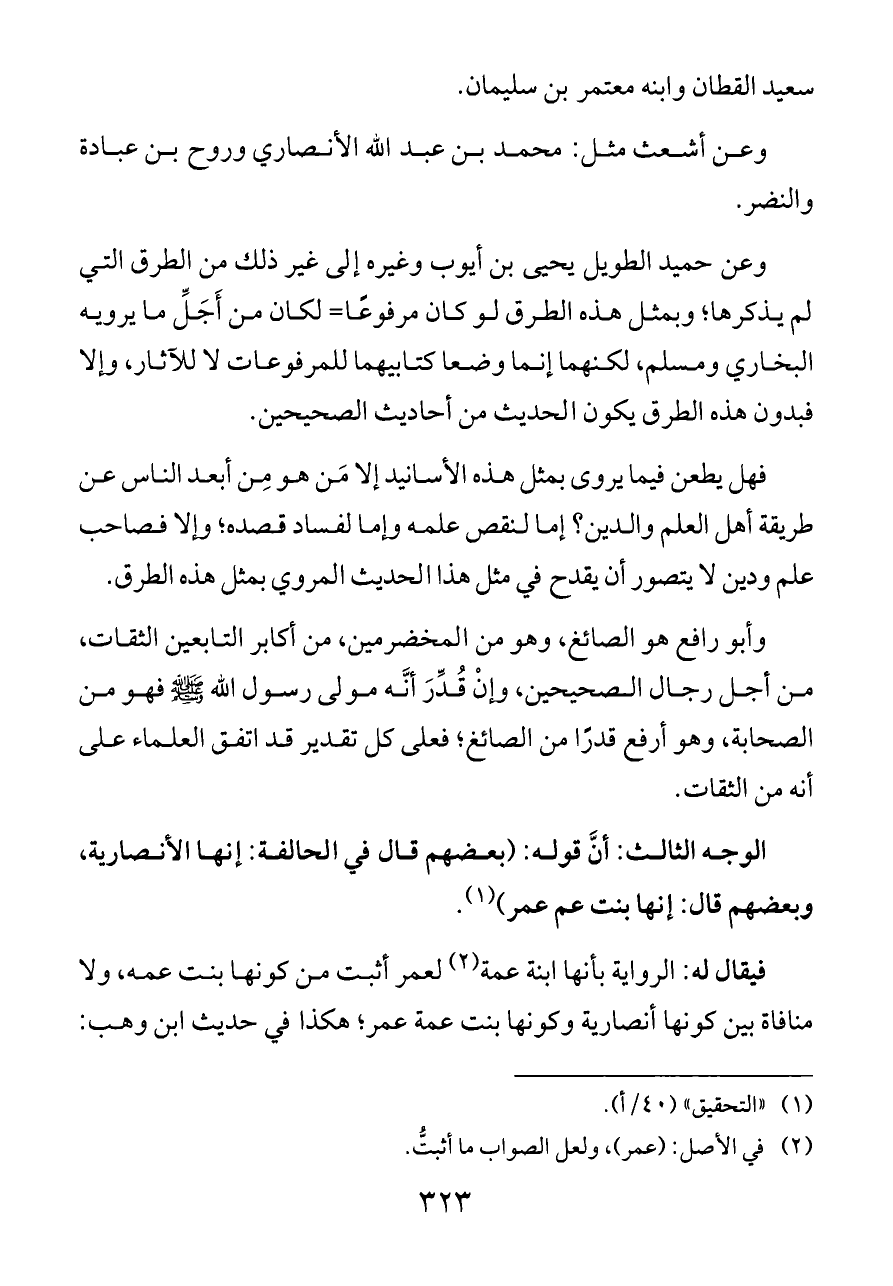 الوجه الثالث: أنَّ قوله: (بعضهم قال في الحالفة: إنها الأنصارية، وبعضهم قال: إنها بنت عم عمر) (¬١).