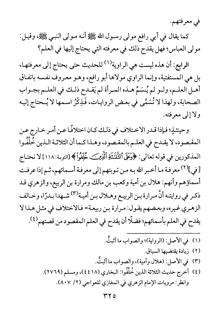 وحينئذٍ؛ فإذا قدر الاختلاف في ذلك كان اختلافًا عن أمر خارج عن المقصود، لا يقدح في العلم بالمقصود، وهذا كما أن الثلاثة الذين خُلِّفُوا المذكورين في قوله تعالى: {وَعَلَى الثَّلَاثَةِ الَّذِينَ خُلِّفُوا} [التوبة: ١١٨] لا نحتاج [في] (¬٢) معرفة ما أخبر الله به من توبتهم إلى معرفة أسمائهم، ثم إذا عرفت أسماؤهم وأنهم: هلال بن أمية وكعب بن مالك ومرارة بن الربيع، والزهري قد ذكر في روايته أنَّ مرارة بن الربيع وهلال بن أمية (¬٣) شهدا بدرًا، وخالف الزهري غيره، وبعضهم يقول: مرارة بن ربيعة= فالاختلاف في مثل هذا لا يقدح في العلم بأسمائهم؛ فضلًا أن يقدح في العلم المقصود من قصتهم (¬٤).