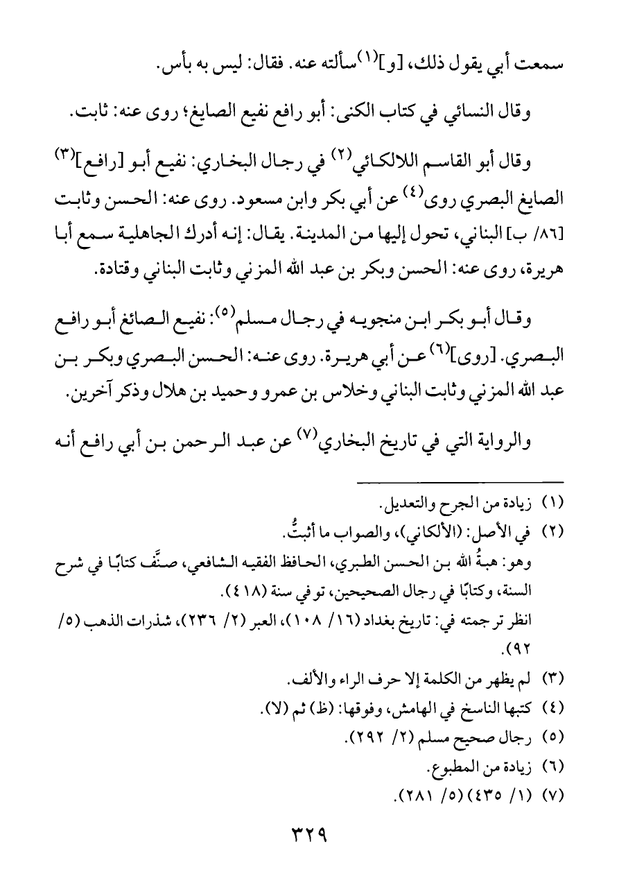 والرواية التي في تاريخ البخاري (¬٧) عن عبد الرحمن بن أبي رافع أنه