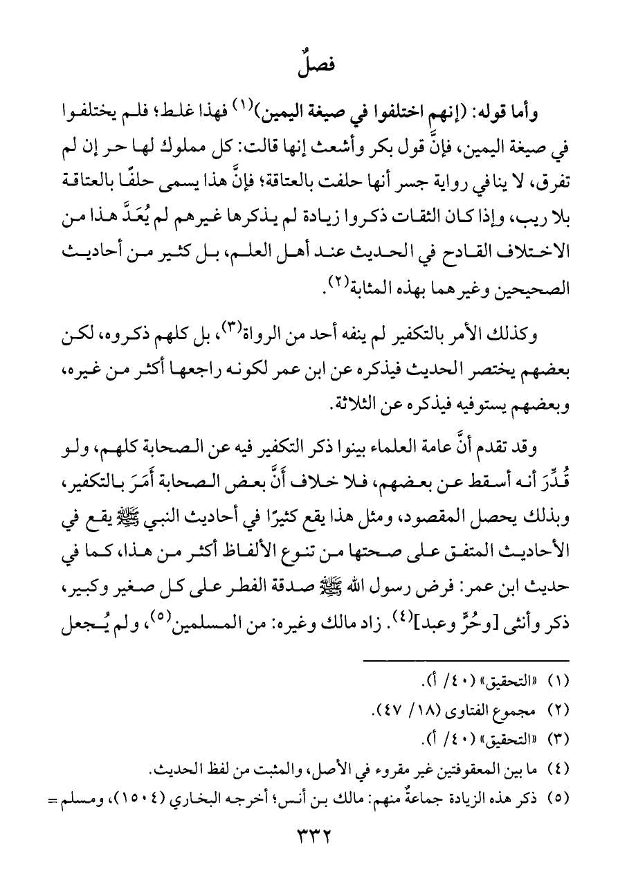 وأما قوله: (إنهم اختلفوا في صيغة اليمين) (¬١) فهذا غلط؛ فلم يختلفوا في صيغة اليمين، فإنَّ قول بكر وأشعث إنها قالت: كل مملوك لها حر إن لم تفرق، لا ينافي رواية جسر أنها حلفت بالعتاقة؛ فإنَّ هذا يسمى حلفًا بالعتاقة بلا ريب، وإذا كان الثقات ذكروا زيادة لم يذكرها غيرهم لم يُعَدَّ هذا من الاختلاف القادح في الحديث عند أهل العلم، بل كثير من أحاديث الصحيحين وغيرهما بهذه المثابة (¬٢).