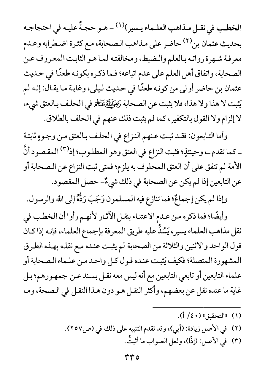 الخطب في نقل مذاهب العلماء يسير) (¬١) = هو حجةٌ عليه في احتجاجه بحديث عثمان بن (¬٢) حاضر على مذاهب الصحابة، مع كثرة اضطرابه وعدم معرفة شهرة رواته بالعلم والضبط، ومخالفته لما هو الثابت المعروف عن الصحابة، واتفاق أهل العلم على عدم اتباعه؛ فما ذكره بكونه طعنًا في حديث عثمان بن حاضر أولى من كونه طعنًا في حديث ليلى، وغاية ما يقال: إنه لم يَثبت لا هذا ولا هذا، فلا يثبت عن الصحابة - رضي الله عنهم - في الحلف بالعتق شيء، لا إلزام ولا القول بالتكفير، كما لم يثبت ذلك عنهم في الحلف بالطلاق.