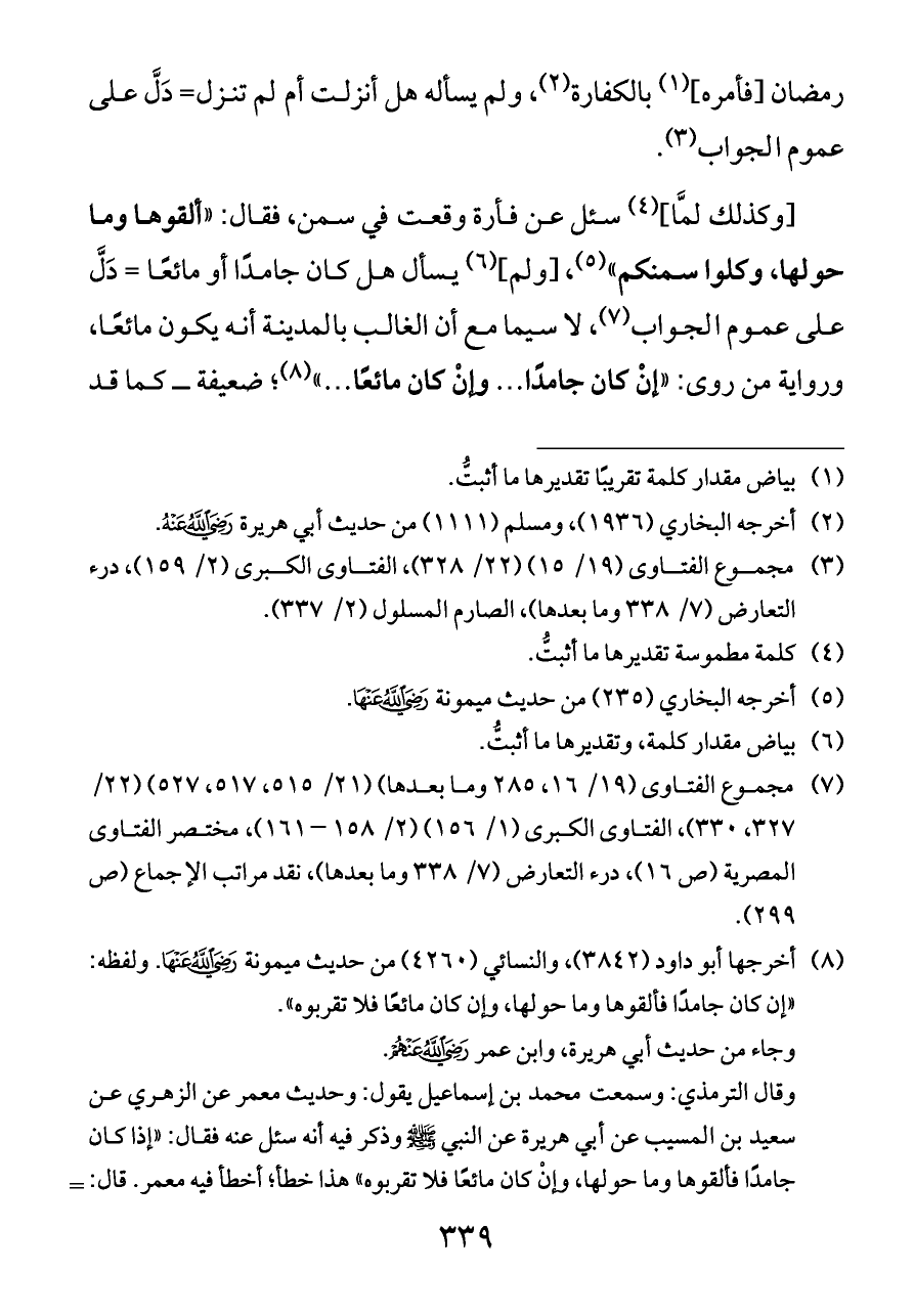 (¬٨) أخرجها أبو داود (٣٨٤٢)، والنسائي (٤٢٦٠) من حديث ميمونة - رضي الله عنها -. ولفظه: «إن كان جامدًا فألقوها وما حولها، وإن كان مائعًا فلا تقربوه».