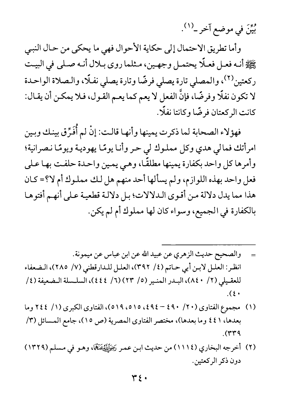 فهؤلاء الصحابة لما ذكرت يمينها وأنها قالت: إنْ لم أُفَرِّق بينك وبين امرأتك فمالي هدي وكل مملوك لي حر وأنا يومًا يهودية ويومًا نصرانية؛ وأمرها كل واحد بكفارة يمينها مطلقًا، وهي يمين واحدة حلفت بها على فعل واحد بهذه اللوازم، ولم يسألها أحد منهم هل لك مملوك أم لا؟ = كان هذا مما يدل دلالة من أقوى الدلالات؛ بل دلالة قطعية على أنهم أفتوها بالكفارة في الجميع، وسواء كان لها مملوك أم لم يكن.
