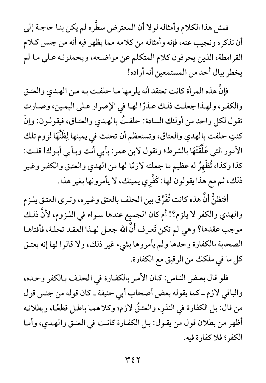 أفتظنُّ أنَّ هذه كانت تُفَرِّق بين الحلف بالعتق وغيره، وترى العتق يلزم والهدي والكفر لا يلزم؟! أم كان الجميع عندها سواء في اللزوم، لأنَّ ذلك موجب عقدها؟ وهي لم تكن تَعرف أَنَّ الله جعل لهذا العقد تحلة، فأفتاها الصحابة بالكفارة وحدها ولم يأمروها بشيء غير ذلك، ولا قالوا لها إنه يعتق كل ما في ملكك من الرقيق مع الكفارة.