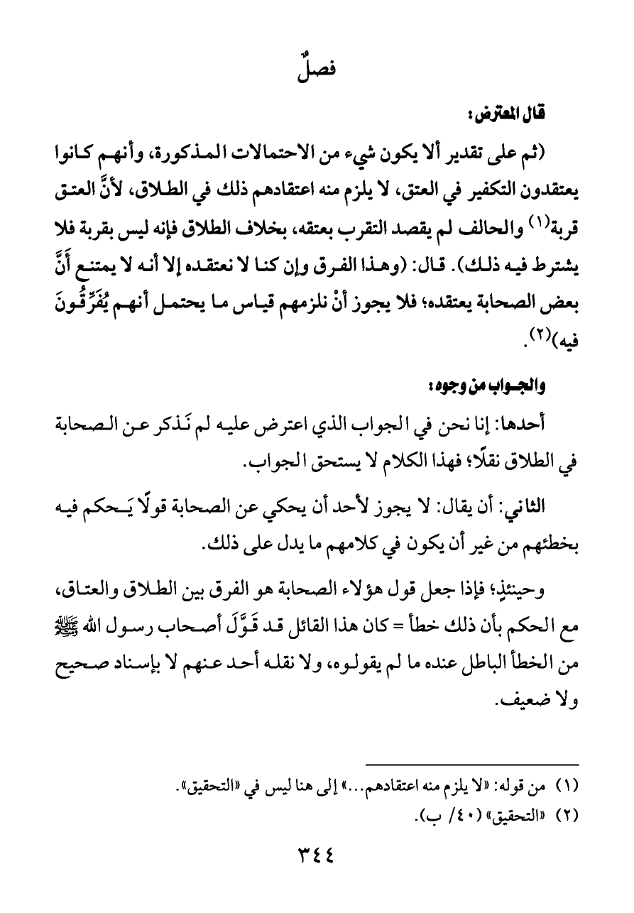 وحينئذٍ؛ فإذا جعل قول هؤلاء الصحابة هو الفرق بين الطلاق والعتاق، مع الحكم بأن ذلك خطأ = كان هذا القائل قد قَوَّلَ أصحاب رسول الله - صلى الله عليه وسلم - من الخطأ الباطل عنده ما لم يقولوه، ولا نقله أحد عنهم لا بإسناد صحيح ولا ضعيف.