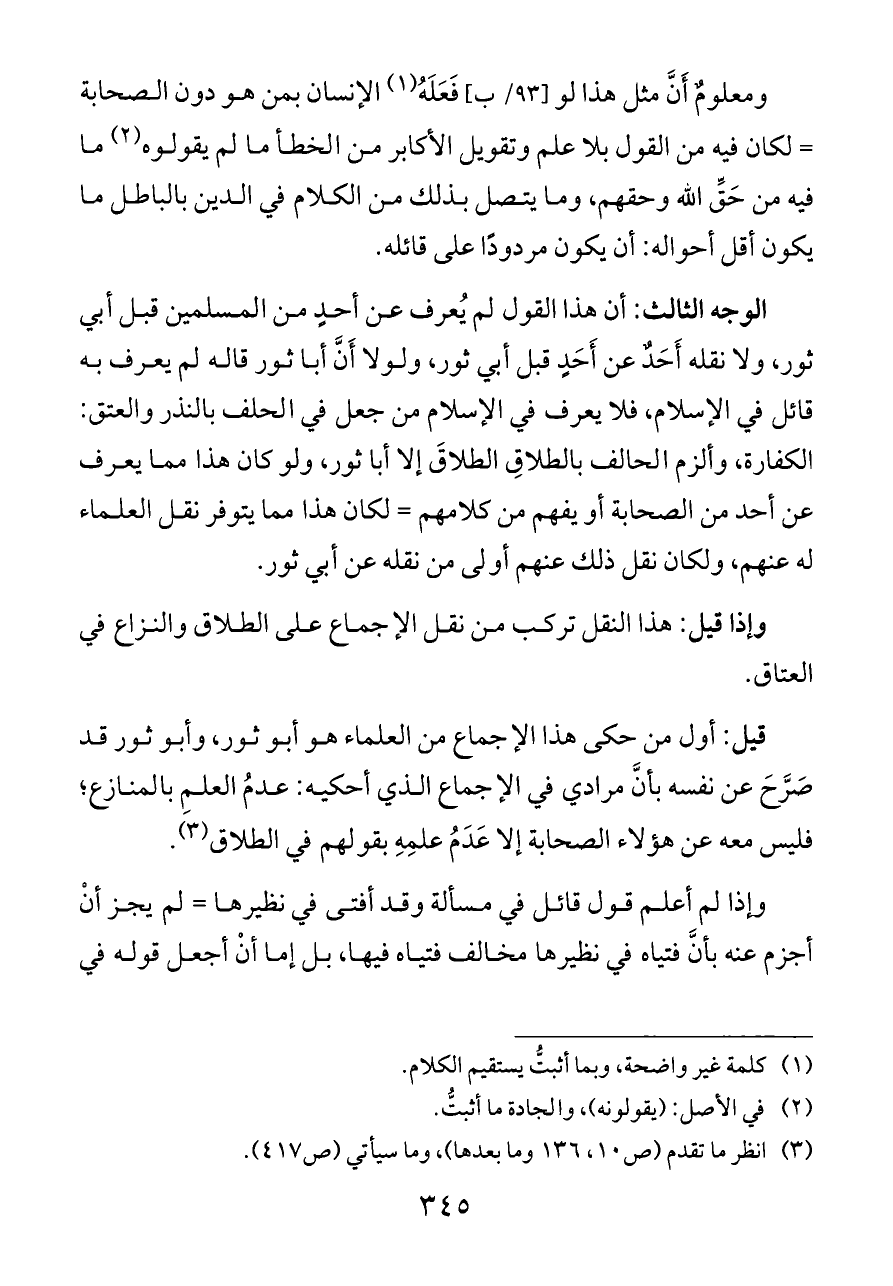 قيل: أول من حكى هذا الإجماع من العلماء هو أبو ثور، وأبو ثور قد صَرَّحَ عن نفسه بأنَّ مرادي في الإجماع الذي أحكيه: عدمُ العلمِ بالمنازع؛ فليس معه عن هؤلاء الصحابة إلا عَدَمُ علمِهِ بقولهم في الطلاق (¬٣).