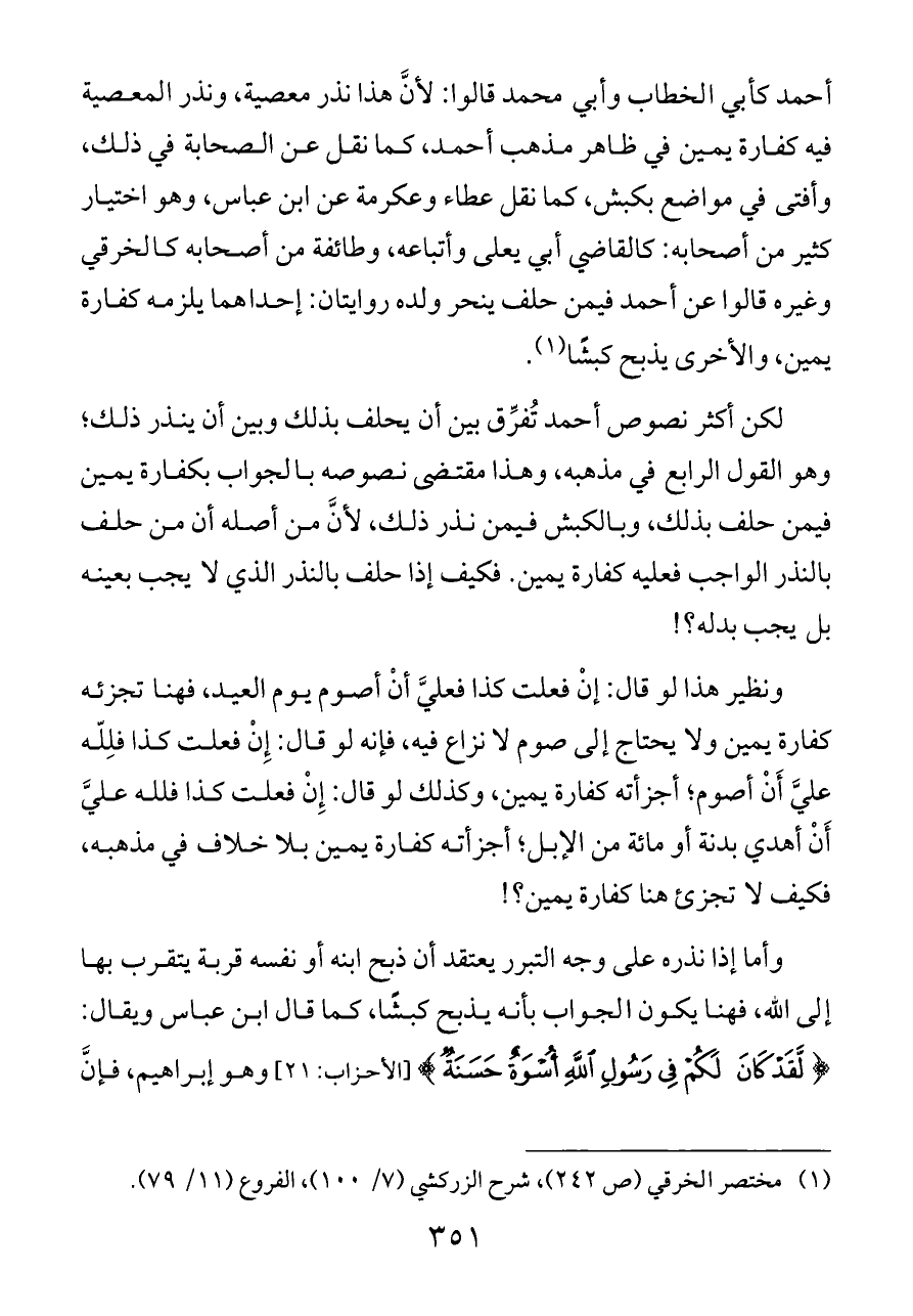 أحمد كأبي الخطاب وأبي محمد قالوا: لأنَّ هذا نذر معصية، ونذر المعصية فيه كفارة يمين في ظاهر مذهب أحمد، كما نقل عن الصحابة في ذلك، وأفتى في مواضع بكبش، كما نقل عطاء وعكرمة عن ابن عباس، وهو اختيار كثير من أصحابه: كالقاضي أبي يعلى وأتباعه، وطائفة من أصحابه كالخرقي وغيره قالوا عن أحمد فيمن حلف ينحر ولده روايتان: إحداهما يلزمه كفارة يمين، والأخرى يذبح كبشًا (¬١).