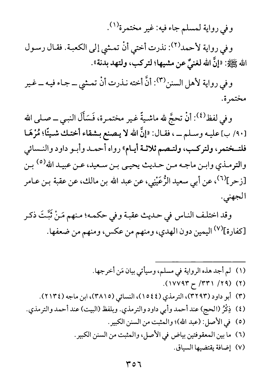 وفي لفظ (¬٤): أنْ تحجَّ لله ماشيةً غير مختمرة، فَسَأَلَ النبي ــ صلى الله [٩٠/ ب] عليه وسلم ــ، فقال: «إنَّ الله لا يصنع بشقاء أختك شيئًا؛ مُرْهَا فلتختمر، ولتركب، ولتصم ثلاثة أيام» رواه أحمد وأبو داود والنسائي والترمذي وابن ماجه من حديث يحيى بن سعيد، عن عبيد الله (¬٥) بن [زحر] (¬٦)، عن أبي سعيد الرُّعَيْنِي، عن عبد الله بن مالك، عن عقبة بن عامر الجهني.