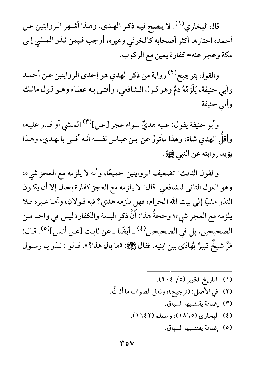 قال البخاري (¬١): لا يصح فيه ذكر الهدي. وهذا أشهر الروايتين عن أحمد، اختارها أكثر أصحابه كالخرقي وغيره، أوجب فيمن نذر المشي إلى مكة وعجز عنه= كفارة يمين مع الركوب.