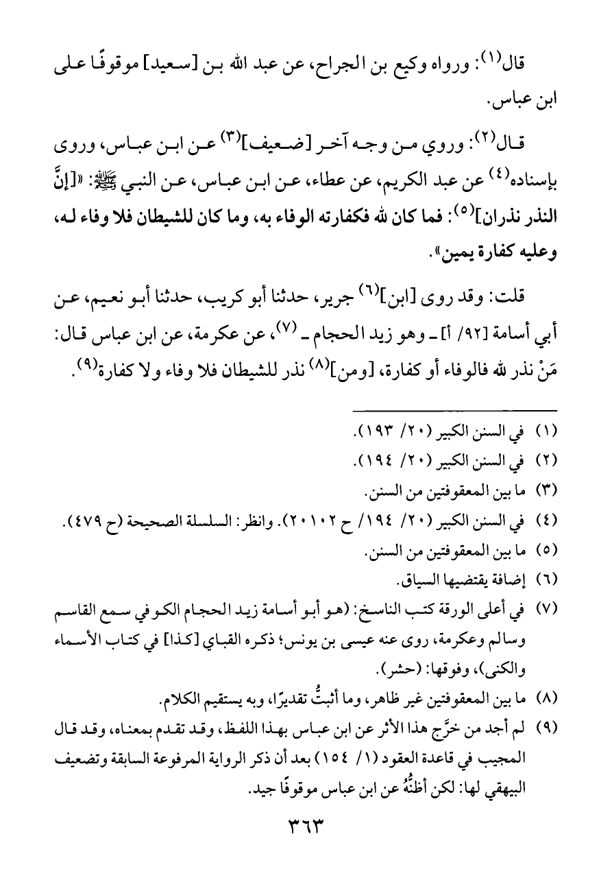 قلت: وقد روى [ابن] (¬٦) جرير، حدثنا أبو كريب، حدثنا أبو نعيم، عن أبي أسامة [٩٢/ أ] ــ وهو زيد الحجام ــ (¬٧)، عن عكرمة، عن ابن عباس قال: مَنْ نذر لله فالوفاء أو كفارة، [ومن] (¬٨) نذر للشيطان فلا وفاء ولا كفارة (¬٩).