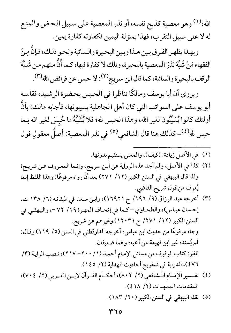وبهذا يظهر الفرق بين هذا وبين البحيرة والسائبة ونحو ذلك، فإنَّ مِنَ الفقهاء مَنْ شَبَّهَ نذرَ المعصية بالبحيرة، وتلك لا كفارة فيها، كما أَنَّ منهم من شَبَّهَ الوقف بالبحيرة والسائبة، كما قال ابن سريج (¬٢): لا حبس عن فرائض الله (¬٣).
