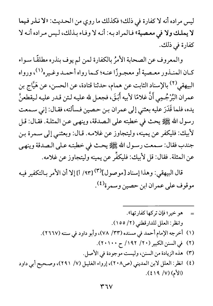 والمعروف عن الصحابة الأمرُ بالكفارة لمن لم يوف بنذره مطلقًا سواء كان المنذور معصية أو معجوزًا عنه؛ كما رواه أحمد وغيره (¬١)، ورواه البيهقي (¬٢) بالإسناد الثابت عن همام، حدثنا قتادة، عن الحسن، عن هَيَّاج بن عمران البُرْجُمِي أَنَّ غلامًا لأبيه أَبَقَ، فجعل لله عليه لئن قدر عليه ليقطعنَّ يده، فلما قَدَرَ عليه بعثني إلى عمران بن حصين فسألته، فقال: إني سمعت رسول الله - صلى الله عليه وسلم - يحث في خطبته على الصدقة، وينهى عن المثلة. فقال: قل لأبيك: فليكفر عن يمينه، وليتجاوز عن غلامه. قال: وبعثني إلى سمرة بن جندب فقال: سمعت رسول الله - صلى الله عليه وسلم - يحث في خطبته على الصدقة وينهى عن المثلة. فقال: قل لأبيك: فليكفِّر عن يمينه وليتجاوز عن غلامه.