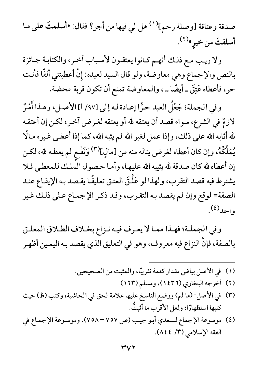 ولا ريب مع ذلك أنهم كانوا يعتقون لأسباب أخر، والكتابة جائزة بالنص والإجماع وهي معاوضة، ولو قال السيد لعبده: إِنْ أعطيتني ألفًا فأنت حر، فأعطاه عَتِقَ ــ أيضًا ــ، والمعاوضة تمنع أن تكون قربة محضة.