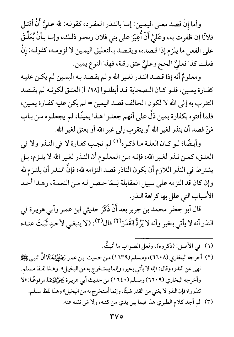 قال أبو جعفر محمد بن جرير بعد أَنْ ذَكَرَ حديثي ابن عمر وأبي هريرة في النذر أنه لا يأتي بخير وأنه لا يَرُدُّ القَدَرَ (¬٢) قال (¬٣): (لا ينبغي لأحدٍ ثَبَتَ عنده
