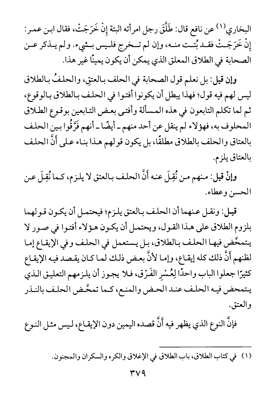 وإن قيل: بل نعلم قول الصحابة في الحلف بالعتقِ، والحلفُ بالطلاق ليس لهم فيه قول؛ فهذا يبطل أن يكونوا أفتوا في الحلف بالطلاق بالوقوع، ثم لما تكلم التابعون في هذه المسألة وأفتى بعض التابعين بوقوع الطلاق المحلوف به، فهؤلاء لم ينقل عن أحد منهم ــ أيضًا ــ أنهم فَرَّقُوا بين الحلف بالعتاق والحلف بالطلاق مطلقًا، بل يكون قولهم هذا بناء على أَنَّ الحلف بالعتاق يلزم.