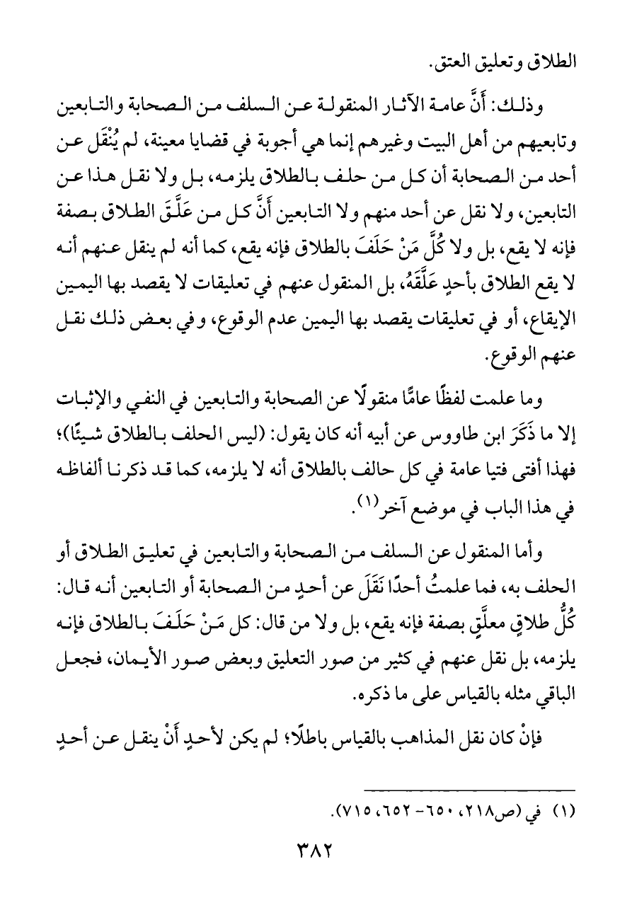 وأما المنقول عن السلف من الصحابة والتابعين في تعليق الطلاق أو الحلف به، فما علمتُ أحدًا نَقَلَ عن أحدٍ من الصحابة أو التابعين أنه قال: كُلُّ طلاقٍ معلَّقٍ بصفة فإنه يقع، بل ولا من قال: كل مَنْ حَلَفَ بالطلاق فإنه يلزمه، بل نقل عنهم في كثير من صور التعليق وبعض صور الأيمان، فجعل الباقي مثله بالقياس على ما ذكره.