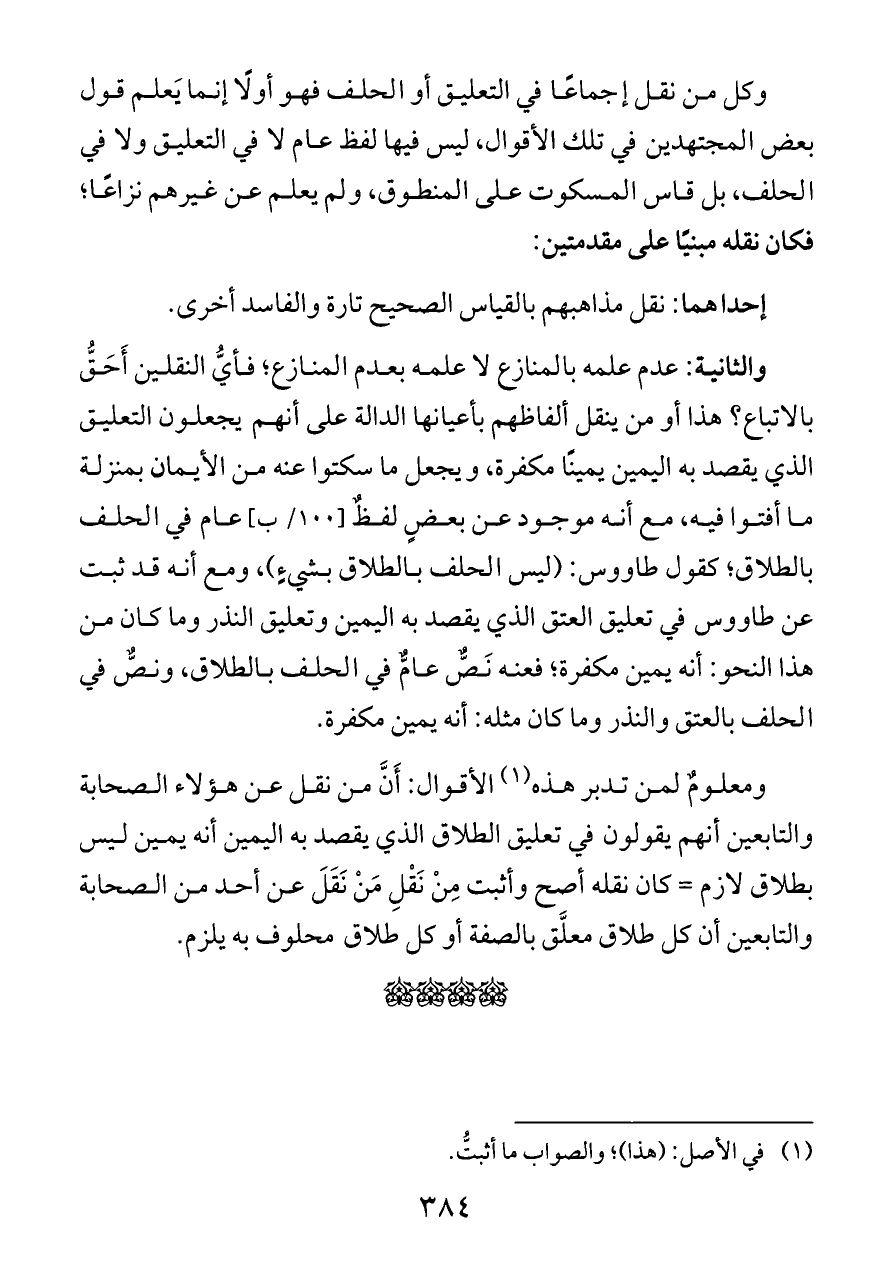 والثانية: عدم علمه بالمنازع لا علمه بعدم المنازع؛ فأيُّ النقلين أَحَقُّ بالاتباع؟ هذا أو من ينقل ألفاظهم بأعيانها الدالة على أنهم يجعلون التعليق الذي يقصد به اليمين يمينًا مكفرة، ويجعل ما سكتوا عنه من الأيمان بمنزلة ما أفتوا فيه، مع أنه موجود عن بعضٍ لفظٌ [١٠٠/ ب] عام في الحلف بالطلاق؛ كقول طاووس: (ليس الحلف بالطلاق بشيءٍ)، ومع أنه قد ثبت عن طاووس في تعليق العتق الذي يقصد به اليمين وتعليق النذر وما كان من هذا النحو: أنه يمين مكفرة؛ فعنه نَصٌّ عامٌّ في الحلف بالطلاق، ونصٌّ في الحلف بالعتق والنذر وما كان مثله: أنه يمين مكفرة.