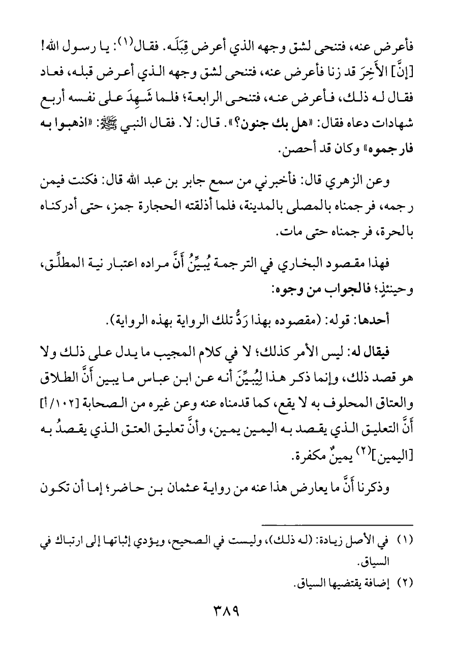 فأعرض عنه، فتنحى لشق وجهه الذي أعرض قِبَلَه. فقال (¬١): يا رسول الله! [إنَّ] الأَخِرَ قد زنا فأعرض عنه، فتنحى لشق وجهه الذي أعرض قبله، فعاد فقال له ذلك، فأعرض عنه، فتنحى الرابعة؛ فلما شَهِدَ على نفسه أربع شهادات دعاه فقال: «هل بك جنون؟». قال: لا. فقال النبي - صلى الله عليه وسلم -: «اذهبوا به فارجموه» وكان قد أحصن.