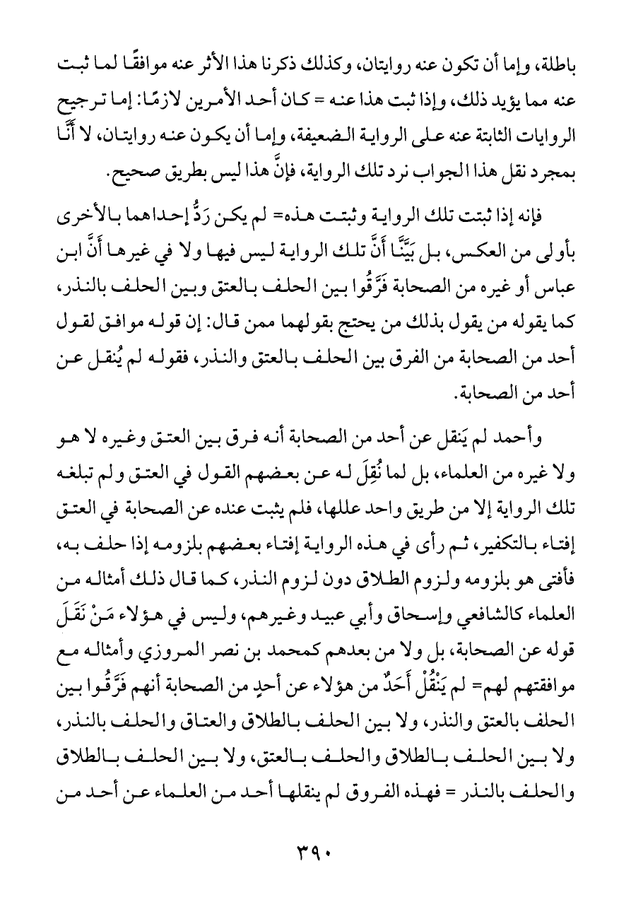 وأحمد لم يَنقل عن أحد من الصحابة أنه فرق بين العتق وغيره لا هو ولا غيره من العلماء، بل لما نُقِلَ له عن بعضهم القول في العتق ولم تبلغه تلك الرواية إلا من طريق واحد عللها، فلم يثبت عنده عن الصحابة في العتق إفتاء بالتكفير، ثم رأى في هذه الرواية إفتاء بعضهم بلزومه إذا حلف به، فأفتى هو بلزومه ولزوم الطلاق دون لزوم النذر، كما قال ذلك أمثاله من العلماء كالشافعي وإسحاق وأبي عبيد وغيرهم، وليس في هؤلاء مَنْ نَقَلَ قوله عن الصحابة، بل ولا من بعدهم كمحمد بن نصر المروزي وأمثاله مع موافقتهم لهم= لم يَنْقُلْ أَحَدٌ من هؤلاء عن أحدٍ من الصحابة أنهم فَرَّقُوا بين الحلف بالعتق والنذر، ولا بين الحلف بالطلاق والعتاق والحلف بالنذر، ولا بين الحلف بالطلاق والحلف بالعتق، ولا بين الحلف بالطلاق والحلف بالنذر = فهذه الفروق لم ينقلها أحد من العلماء عن أحد من