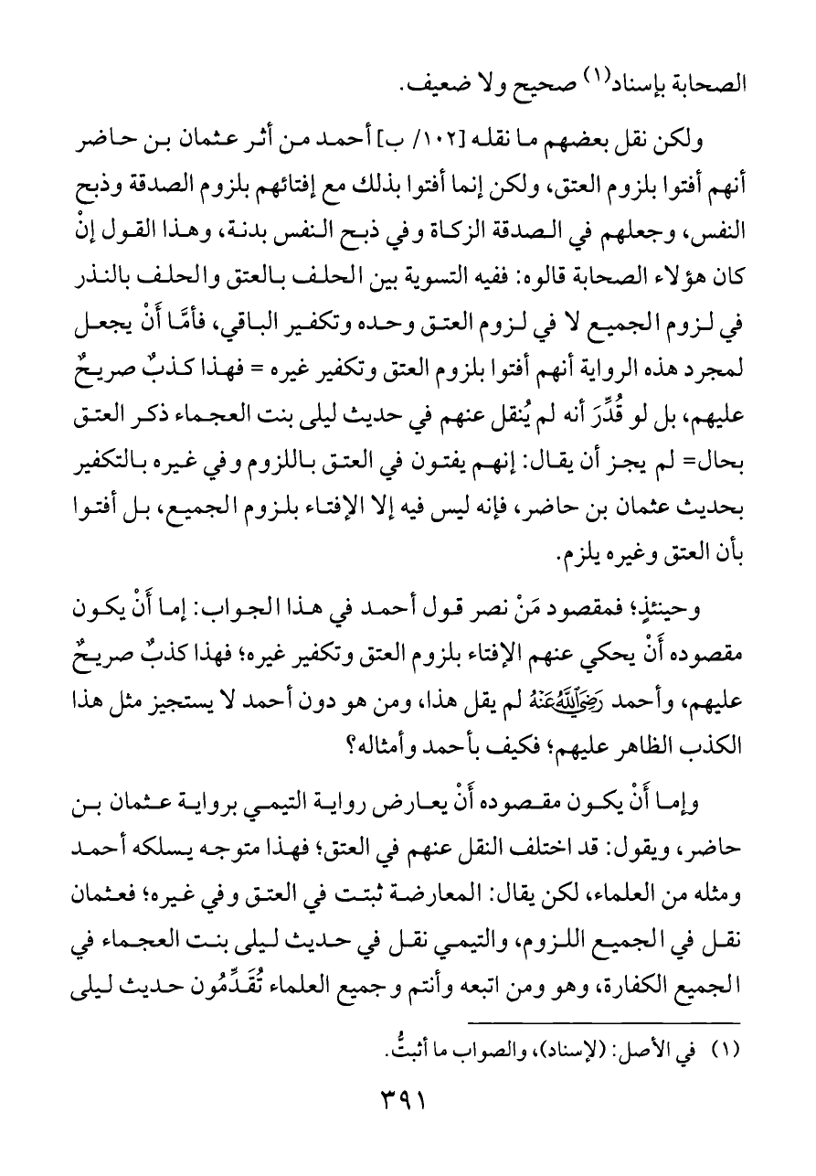 ولكن نقل بعضهم ما نقله [١٠٢/ ب] أحمد من أثر عثمان بن حاضر أنهم أفتوا بلزوم العتق، ولكن إنما أفتوا بذلك مع إفتائهم بلزوم الصدقة وذبح النفس، وجعلهم في الصدقة الزكاة وفي ذبح النفس بدنة، وهذا القول إنْ كان هؤلاء الصحابة قالوه: ففيه التسوية بين الحلف بالعتق والحلف بالنذر في لزوم الجميع لا في لزوم العتق وحده وتكفير الباقي، فأمَّا أَنْ يجعل لمجرد هذه الرواية أنهم أفتوا بلزوم العتق وتكفير غيره = فهذا كذبٌ صريحٌ عليهم، بل لو قُدِّرَ أنه لم يُنقل عنهم في حديث ليلى بنت العجماء ذكر العتق بحال= لم يجز أن يقال: إنهم يفتون في العتق باللزوم وفي غيره بالتكفير بحديث عثمان بن حاضر، فإنه ليس فيه إلا الإفتاء بلزوم الجميع، بل أفتوا بأن العتق وغيره يلزم.