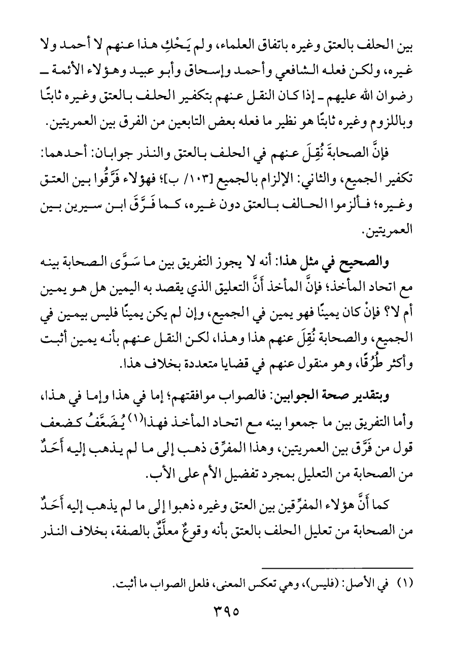 فإنَّ الصحابةَ نُقِلَ عنهم في الحلف بالعتق والنذر جوابان: أحدهما: تكفير الجميع، والثاني: الإلزام بالجميع [١٠٣/ ب]؛ فهؤلاء فَرَّقُوا بين العتق وغيره؛ فألزموا الحالف بالعتق دون غيره، كما فَرَّقَ ابن سيرين بين العمريتين.
