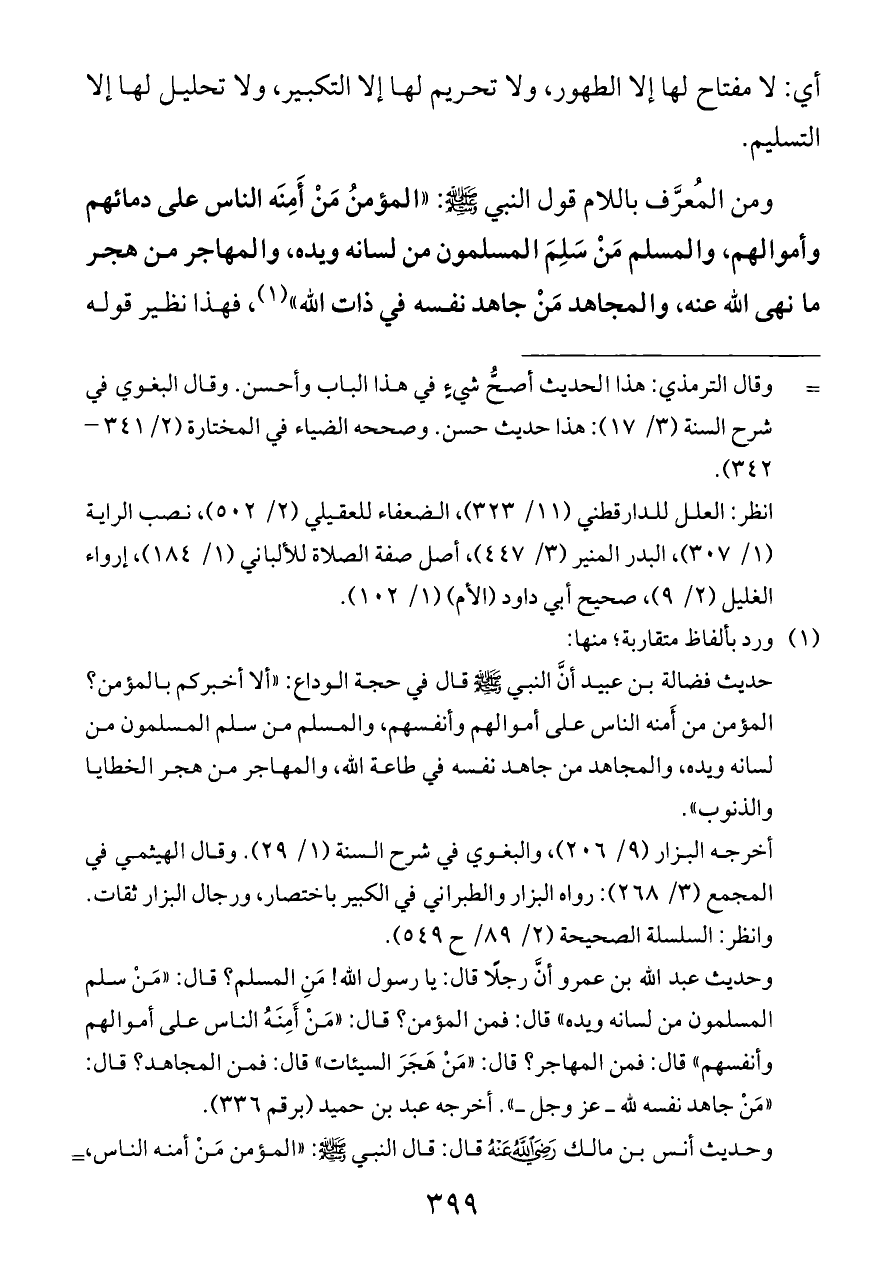 وحديث عبد الله بن عمرو أنَّ رجلًا قال: يا رسول الله! مَنِ المسلم؟ قال: «مَنْ سلم المسلمون من لسانه ويده» قال: فمن المؤمن؟ قال: «مَنْ أَمِنَهُ الناس على أموالهم وأنفسهم» قال: فمن المهاجر؟ قال: «مَنْ هَجَرَ السيئات» قال: فمن المجاهد؟ قال: «مَنْ جاهد نفسه لله ــ عز وجل ــ». أخرجه عبد بن حميد (برقم ٣٣٦).
