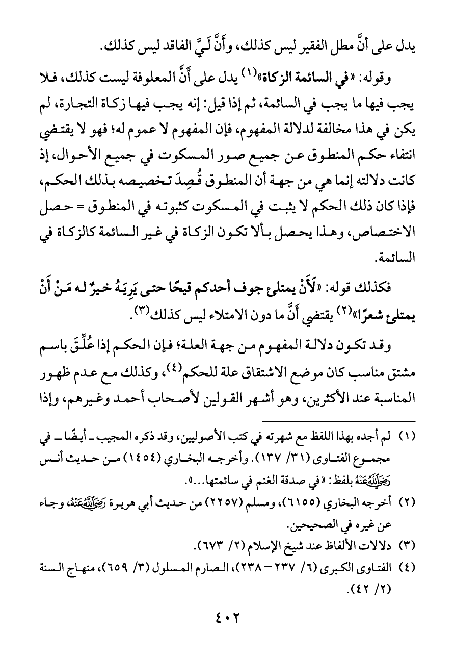 (¬١) لم أجده بهذا اللفظ مع شهرته في كتب الأصوليين، وقد ذكره المجيب ــ أيضًا ــ في مجموع الفتاوى (٣١/ ١٣٧). وأخرجه البخاري (١٤٥٤) من حديث أنس - رضي الله عنه - بلفظ: «في صدقة الغنم في سائمتها ... ».