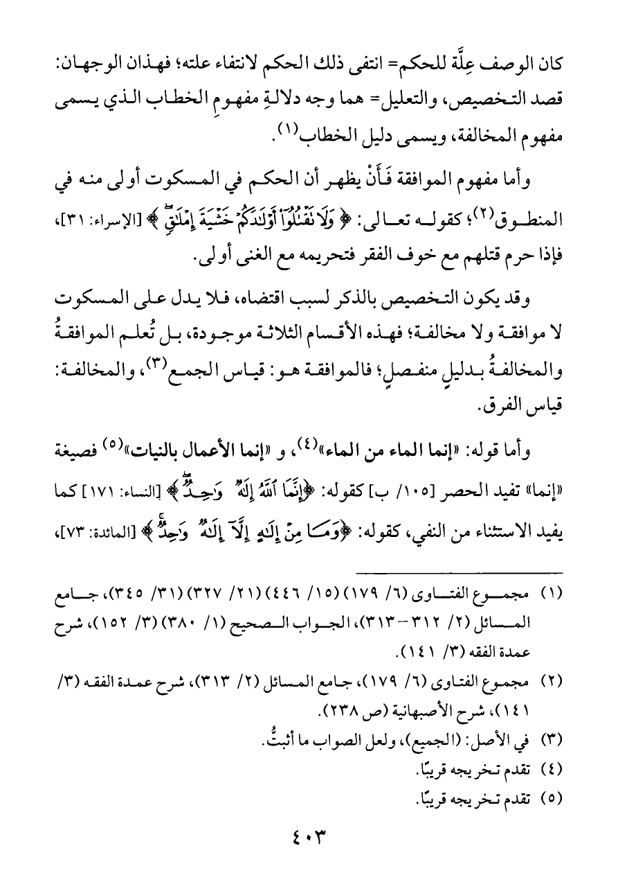 كان الوصف عِلَّة للحكم= انتفى ذلك الحكم لانتفاء علته؛ فهذان الوجهان: قصد التخصيص، والتعليل= هما وجه دلالةِ مفهومِ الخطاب الذي يسمى مفهوم المخالفة، ويسمى دليل الخطاب (¬١).