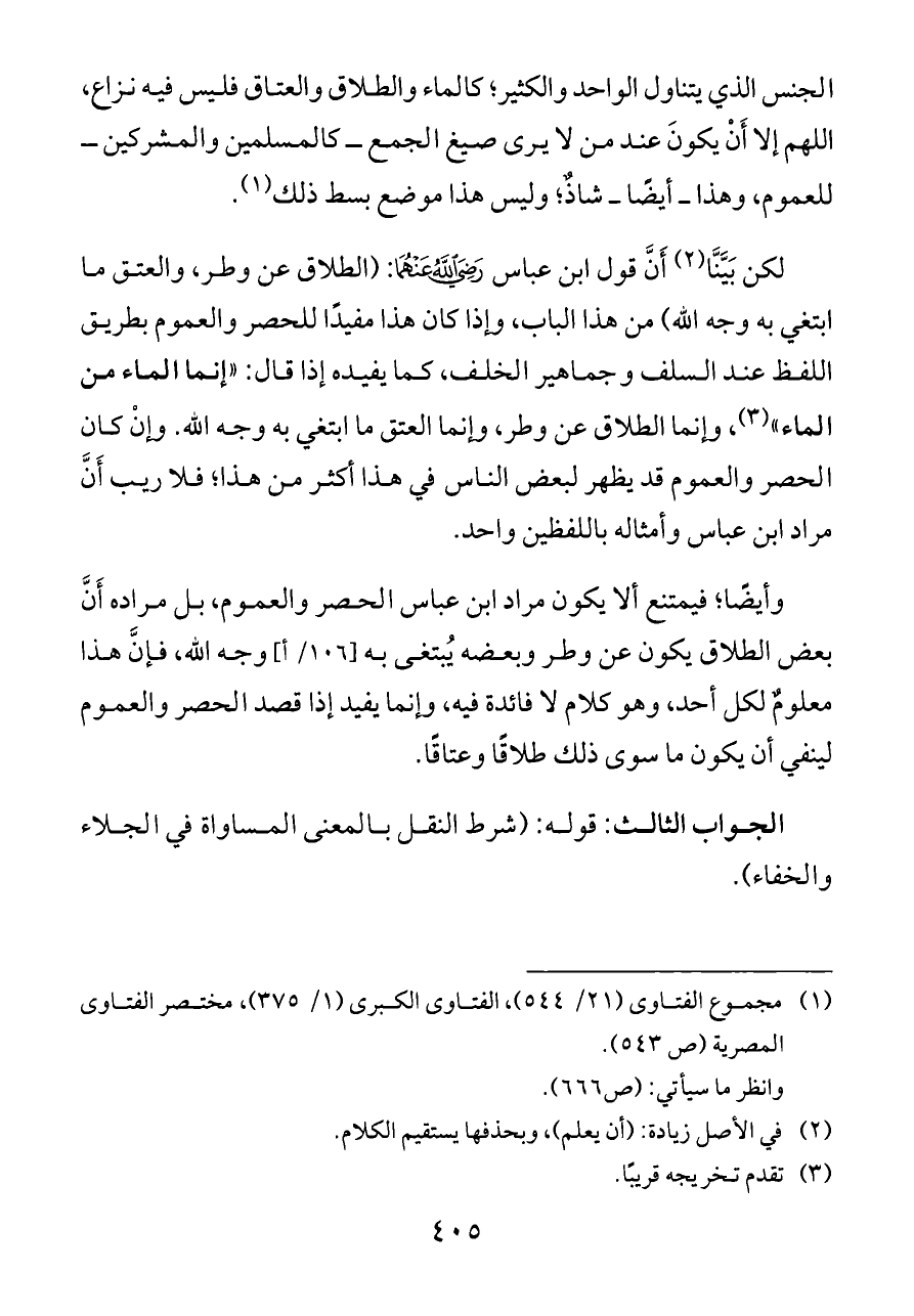 لكن بَيَّنَّا (¬٢) أَنَّ قول ابن عباس - رضي الله عنهما -: (الطلاق عن وطر، والعتق ما ابتغي به وجه الله) من هذا الباب، وإذا كان هذا مفيدًا للحصر والعموم بطريق اللفظ عند السلف وجماهير الخلف، كما يفيده إذا قال: «إنما الماء من الماء» (¬٣)، وإنما الطلاق عن وطر، وإنما العتق ما ابتغي به وجه الله. وإنْ كان الحصر والعموم قد يظهر لبعض الناس في هذا أكثر من هذا؛ فلا ريب أَنَّ مراد ابن عباس وأمثاله باللفظين واحد.