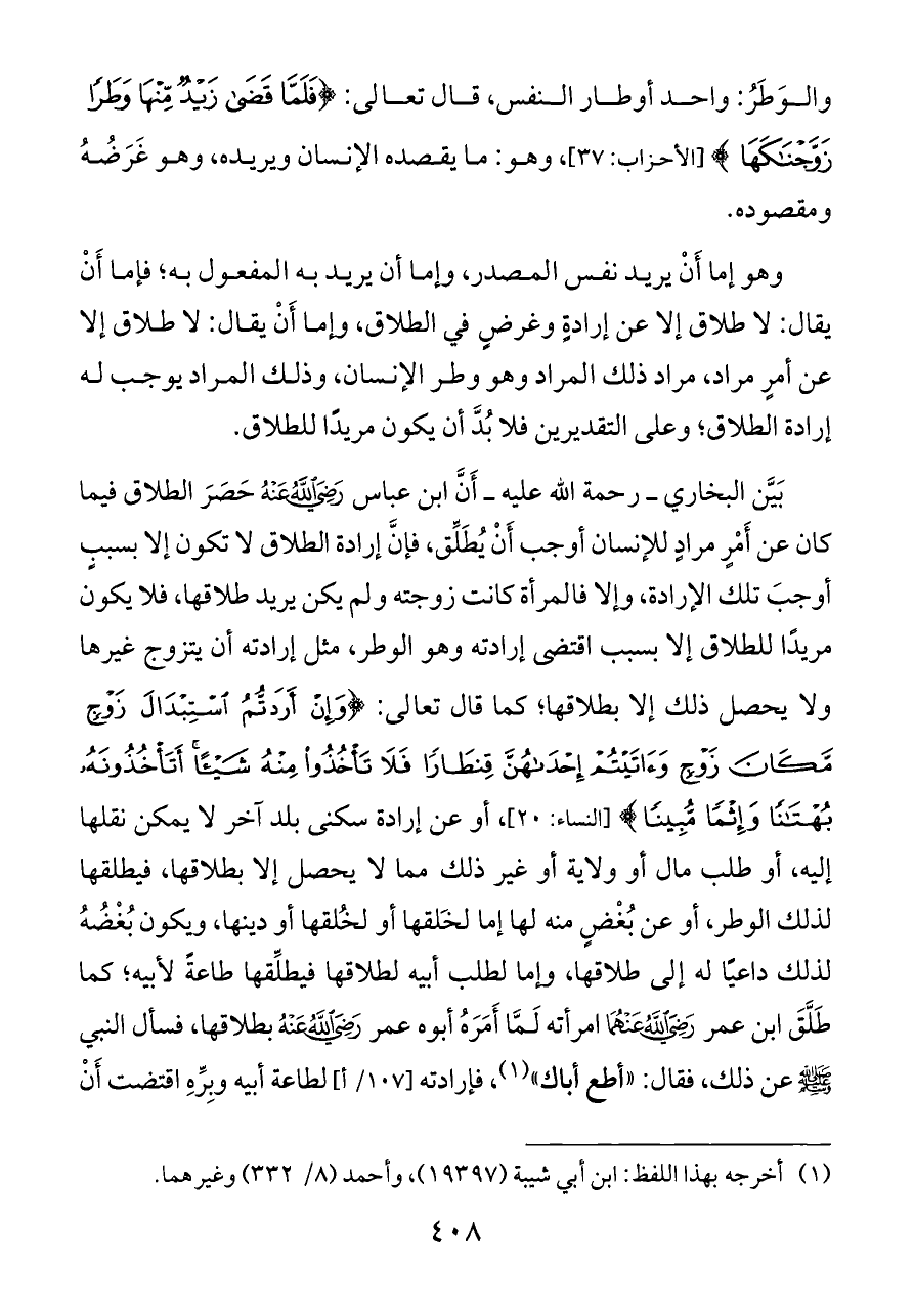 بَيَّن البخاري ــ رحمة الله عليه ــ أَنَّ ابن عباس - رضي الله عنه - حَصَرَ الطلاق فيما كان عن أَمْرٍ مرادٍ للإنسان أوجب أَنْ يُطَلِّق، فإنَّ إرادة الطلاق لا تكون إلا بسببٍ أوجبَ تلك الإرادة، وإلا فالمرأة كانت زوجته ولم يكن يريد طلاقها، فلا يكون مريدًا للطلاق إلا بسبب اقتضى إرادته وهو الوطر، مثل إرادته أن يتزوج غيرها ولا يحصل ذلك إلا بطلاقها؛ كما قال تعالى: {وَإِنْ أَرَدْتُمُ اسْتِبْدَالَ زَوْجٍ مَكَانَ زَوْجٍ وَآتَيْتُمْ إِحْدَاهُنَّ قِنْطَارًا فَلَا تَأْخُذُوا مِنْهُ شَيْئًا أَتَأْخُذُونَهُ بُهْتَانًا وَإِثْمًا مُبِينًا} [النساء: ٢٠]، أو عن إرادة سكنى بلد آخر لا يمكن نقلها إليه، أو طلب مال أو ولاية أو غير ذلك مما لا يحصل إلا بطلاقها، فيطلقها لذلك الوطر، أو عن بُغْضٍ منه لها إما لخَلقها أو لخُلقها أو دينها، ويكون بُغْضُهُ لذلك داعيًا له إلى طلاقها، وإما لطلب أبيه لطلاقها فيطلِّقها طاعةً لأبيه؛ كما طَلَّقَ ابن عمر - رضي الله عنهما - امرأته لَمَّا أَمَرَهُ أبوه عمر - رضي الله عنه - بطلاقها، فسأل النبي - صلى الله عليه وسلم - عن ذلك، فقال: «أطع أباك» (¬١)، فإرادته [١٠٧/ أ] لطاعة أبيه وبِرِّهِ اقتضت أَنْ