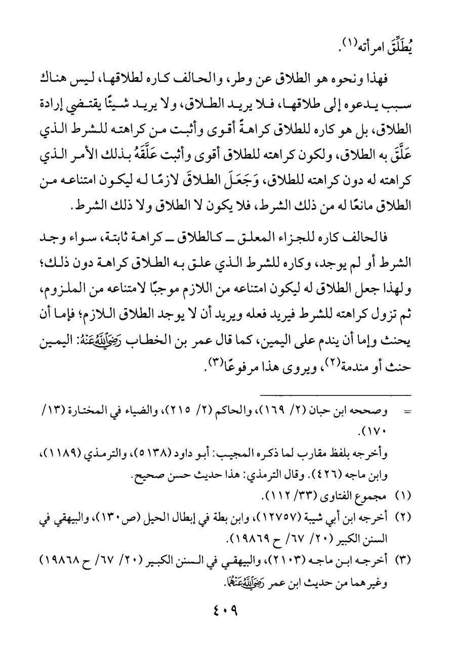 فالحالف كاره للجزاء المعلق ــ كالطلاق ــ كراهة ثابتة، سواء وجد الشرط أو لم يوجد، وكاره للشرط الذي علق به الطلاق كراهة دون ذلك؛ ولهذا جعل الطلاق له ليكون امتناعه من اللازم موجبًا لامتناعه من الملزوم، ثم تزول كراهته للشرط فيريد فعله ويريد أن لا يوجد الطلاق اللازم؛ فإما أن يحنث وإما أن يندم على اليمين، كما قال عمر بن الخطاب - رضي الله عنه -: اليمين حنث أو مندمة (¬٢)، ويروى هذا مرفوعًا (¬٣).