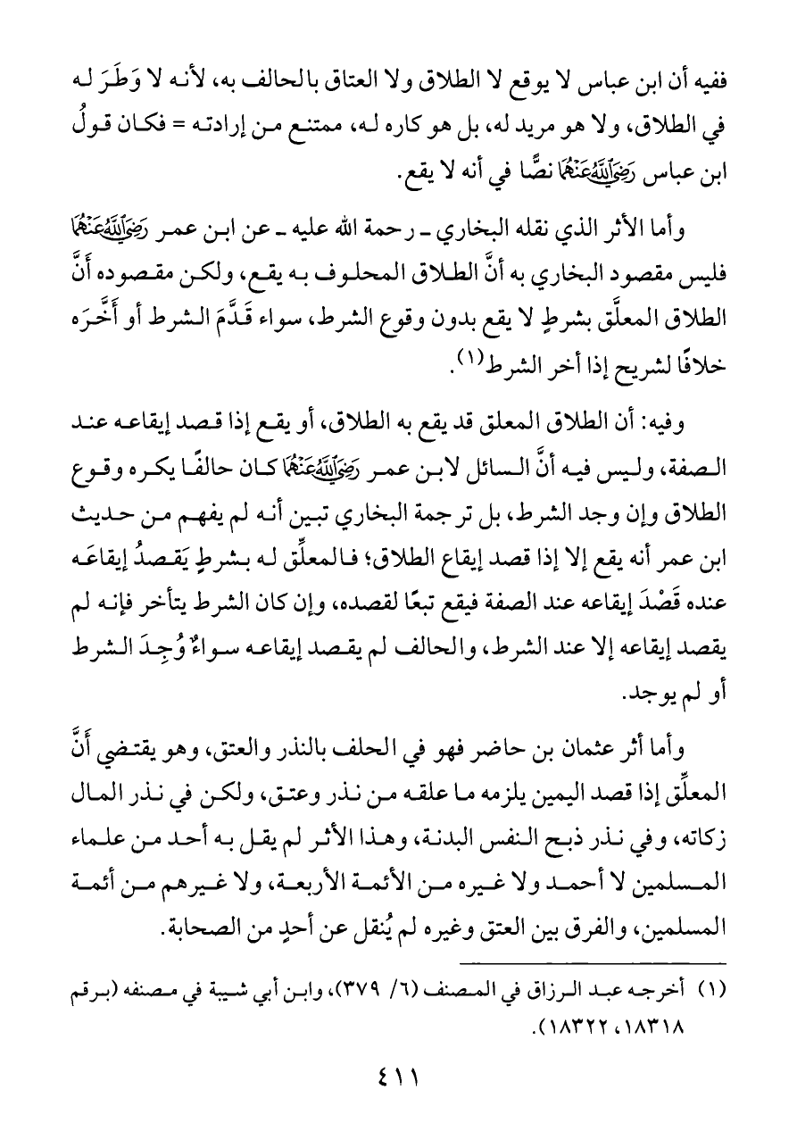 وأما الأثر الذي نقله البخاري ــ رحمة الله عليه ــ عن ابن عمر - رضي الله عنهما - فليس مقصود البخاري به أنَّ الطلاق المحلوف به يقع، ولكن مقصوده أَنَّ الطلاق المعلَّق بشرطٍ لا يقع بدون وقوع الشرط، سواء قَدَّمَ الشرط أو أَخَّرَه خلافًا لشريح إذا أخر الشرط (¬١).