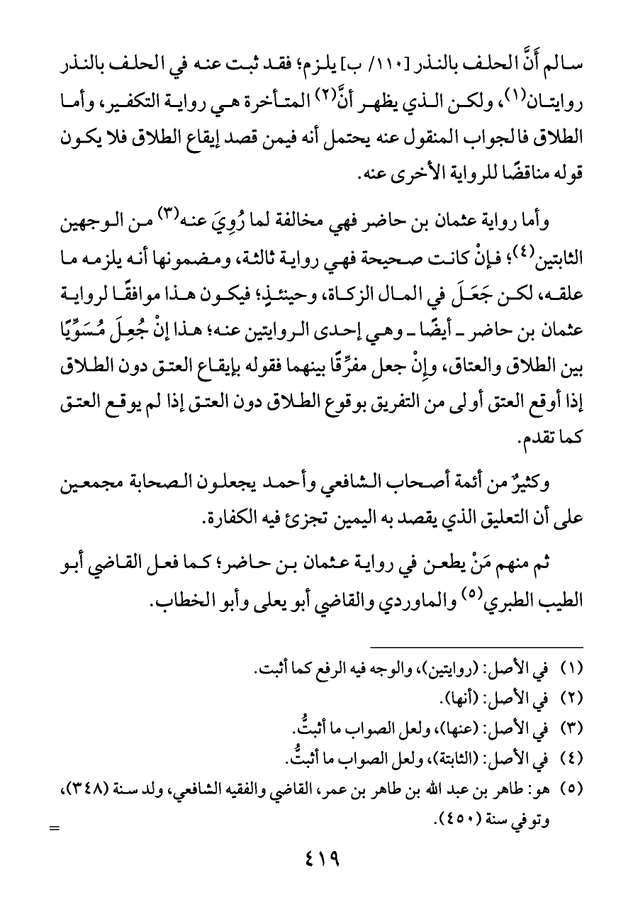 سالم أَنَّ الحلف بالنذر [١١٠/ ب] يلزم؛ فقد ثبت عنه في الحلف بالنذر روايتان (¬١)، ولكن الذي يظهر أنَّ (¬٢) المتأخرة هي رواية التكفير، وأما الطلاق فالجواب المنقول عنه يحتمل أنه فيمن قصد إيقاع الطلاق فلا يكون قوله مناقضًا للرواية الأخرى عنه.