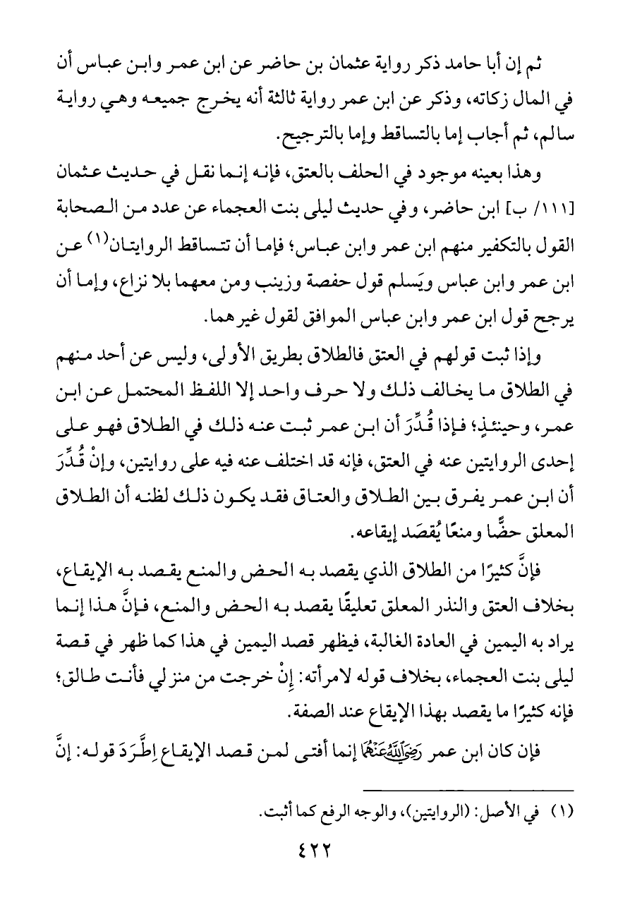 وهذا بعينه موجود في الحلف بالعتق، فإنه إنما نقل في حديث عثمان [١١١/ ب] ابن حاضر، وفي حديث ليلى بنت العجماء عن عدد من الصحابة القول بالتكفير منهم ابن عمر وابن عباس؛ فإما أن تتساقط الروايتان (¬١) عن ابن عمر وابن عباس ويَسلم قول حفصة وزينب ومن معهما بلا نزاع، وإما أن يرجح قول ابن عمر وابن عباس الموافق لقول غيرهما.