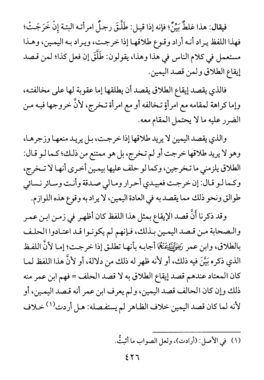 وقد ذكرنا أَنَّ قصد الإيقاع بمثل هذا اللفظ كان أظهر في زمن ابن عمر والصحابة من قصد اليمين بذلك، فإنهم لم يكونوا قد اعتادوا الحلف بالطلاق، وابن عمر - رضي الله عنهما - أجابه بأنها تطلق إذا خرجت؛ إما لأنَّ اللفظ الذي ذكره بَيَّنَ فيه ذلك، أو لأنه ظهر له ذلك من دلالة، أو لأنَّ هذا اللفظ لما كان المعتاد عندهم قصد إيقاع الطلاق به لا قصد الحلف = فهم ابن عمر منه ذلك وإن كان الحالف قصد اليمين، ولم يعرف ابن عمر أنه قصد اليمين، أو لأنه لما كان قصد اليمين خلاف الظاهر لم يستفصله: هل أردت (¬١) خلاف