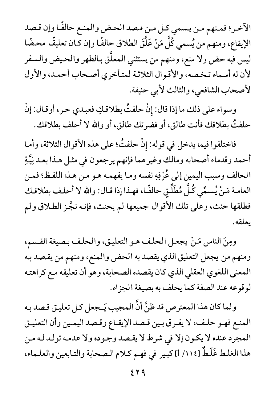 ولما كان هذا المعترض قد ظنَّ أنَّ المجيب يَجعل كل تعليق قصد به المنع فهو حلف، لا يفرق بين قصد الإيقاع وقصد اليمين وأن التعليق المجرد عنده لا يكون إلا في شرط لا يقصد وجوده ولا عدمه تولد له من هذا الغلط غَلَطٌ [١١٤/ أ] كبير في فهم كلام الصحابة والتابعين والعلماء،
