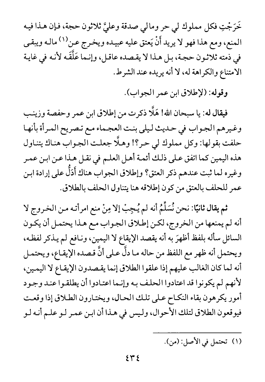 ثم يقال ثانيًا: نحن نُسَلِّمُ أنه لم يُجِبْ إلا مِنْ منع امرأته من الخروج لا أنه لم يمنعها من الخروج، لكن إطلاق الجواب مع هذا يحتمل أن يكون السائل سأله بلفظ أظهرَ به أنه يقصد الإيقاع لا اليمين، ونافع لم يذكر لفظه، ويحتمل أنه ظهر مع اللفظ من حاله ما دلَّ على أنَّ قصده الإيقاع، ويحتمل أنه لما كان الغالب عليهم إذا علقوا الطلاق إنما يقصدون الإيقاع لا اليمين، لأنهم لم يكونوا قد اعتادوا الحلف به وإنما اعتادوا أن يطلقوا عند وجود أمور يكرهون بقاء النكاح على تلك الحال، ويختارون الطلاق إذا وقعت فيوقعون الطلاق لتلك الأحوال، وليس في هذا أن ابن عمر لو علم أنه لو