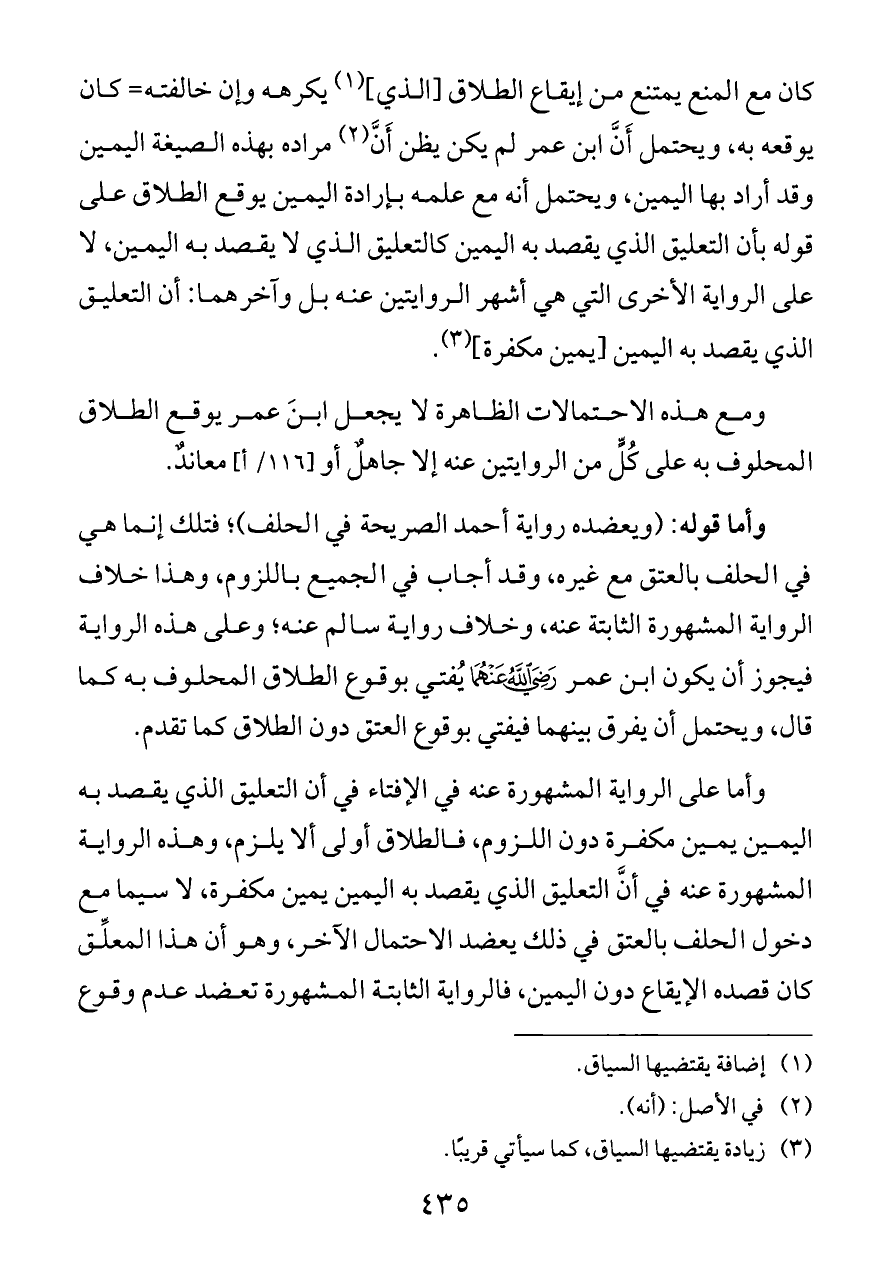 ومع هذه الاحتمالات الظاهرة لا يجعل ابنَ عمر يوقع الطلاق المحلوف به على كُلٍّ من الروايتين عنه إلا جاهلٌ أو [١١٦/ أ] معاندٌ.